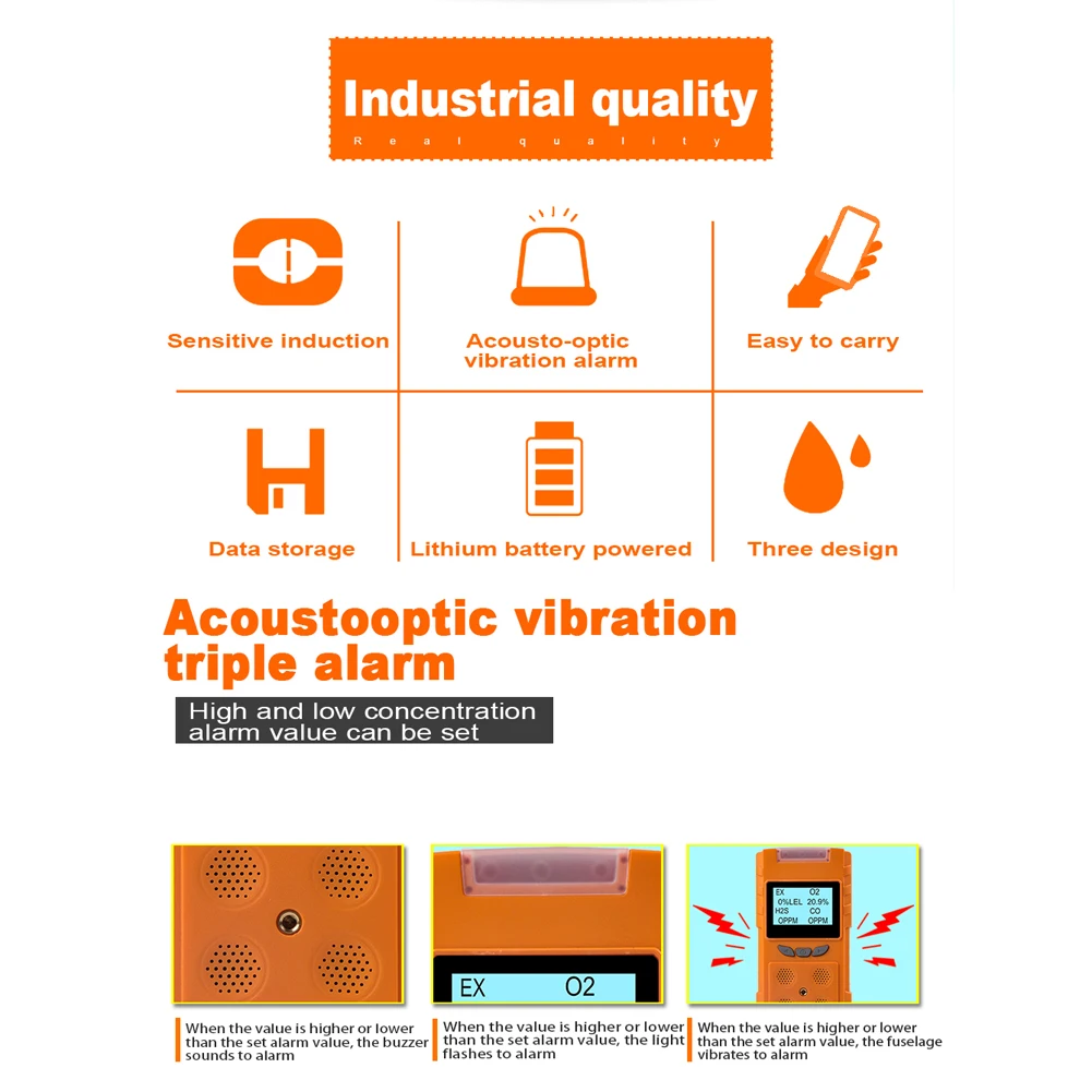 Тройной сигнал тревоги:Когда значение выше или ниже установленного значения тревоги, этот детектор газов может гудеть или мигать светильник, а фюзеляж вибрирует вам alalrm.