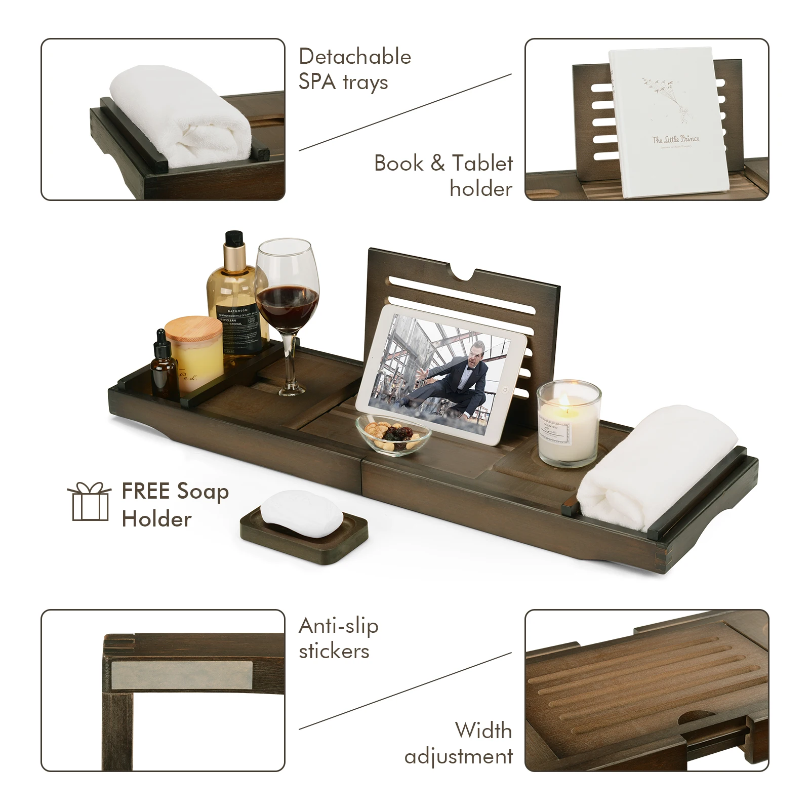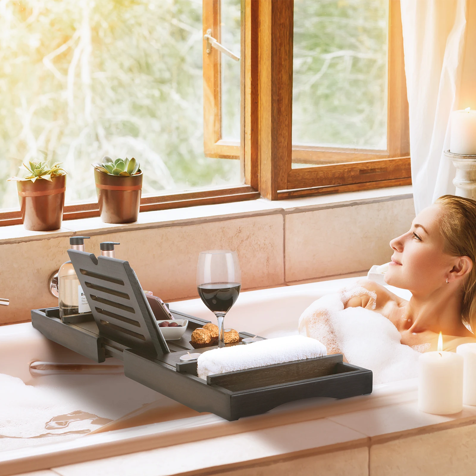 Расширяемый дизайн подходит для всех стандартных ванн шириной от 30 до 43 дюймов и позволяет безопасно доставлять ваши умные устройства, бокал для вина и полотенце в лоток, не опасаясь разливов или капель. Большой дизайн гарантирует, что наш caddy может расшириться, чтобы соответствовать широкому спектру ванн