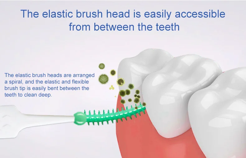 Силиконовые Мягкие межзубные зубочистки имеют мягкие и удобные щетинки, которые могут аккуратно удалить зубной налет, чистую еду и массажные десны. Мягкие силиконовые щетинки легко вставляются в большинство зубов, тем самым устраняя налет, который часто возникает при болезни десен и не может быть тронут зубной щеткой. Таким образом, это определенно идеальный инструмент для чистки полости рта для вас и вашей семьи, вы должны иметь!