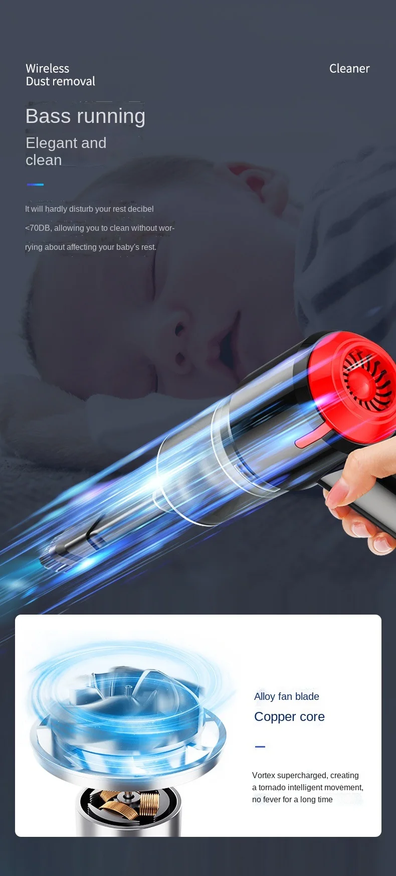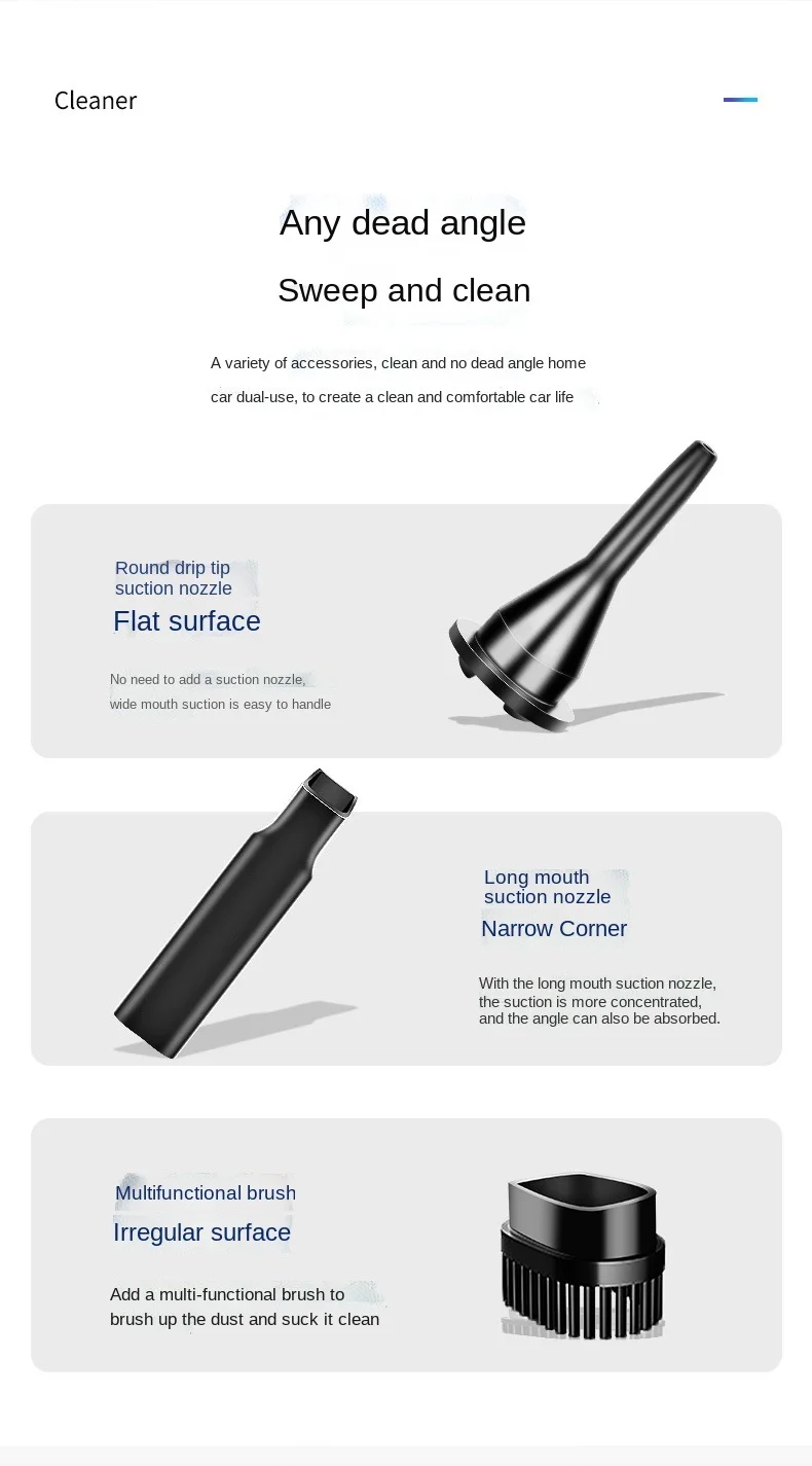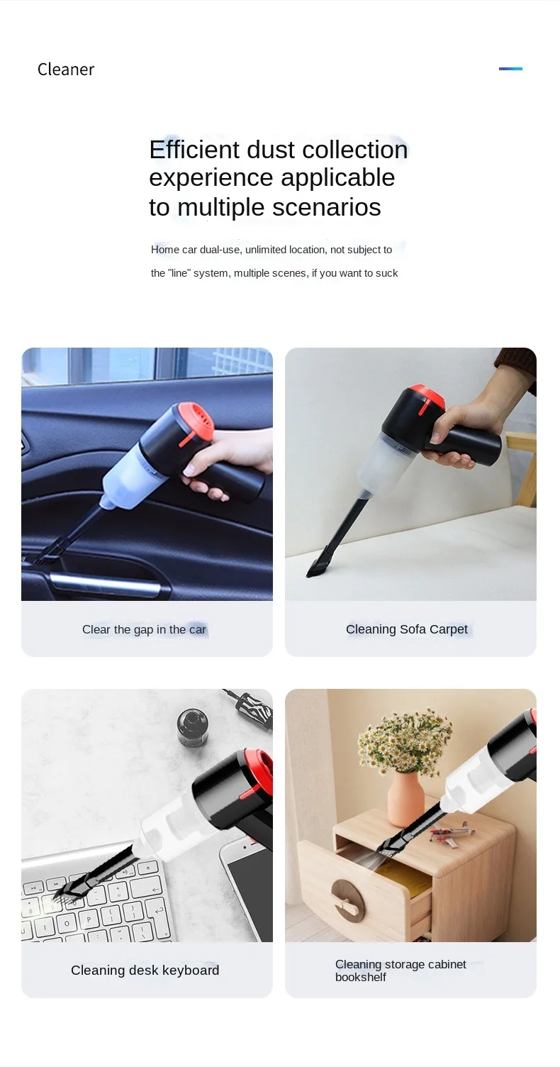 Модель: автомобильный пылесос <;br/> Материал: ABS<;br/> Номинальная скорость: 35500 об/мин <;br/> Номинальное напряжение: 5<;br/> Номинальная входная мощность: 60<;br/> Основная область применения: Двойное использование для дома и автомобиля <;br/> Мощность вакуумного всасывания: 4500
