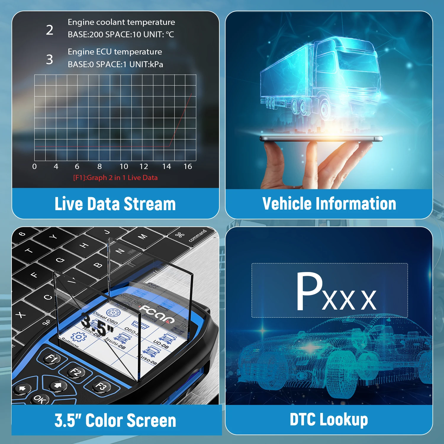 ➤【Расширенные функции для грузовиков: скорость двигателя, температура ЭБУ двигателя, процентное положение педали ускорения, температура интеркулера двигателя, температура охлаждающей жидкости двигателя, напряжение батареи, напряжение генератора, температура окружающего воздуха, температура воздуха на входе, установка единиц измерения на SAE английском/метрическом., обновление Интернета, общие функции s: Чтение информации о ECU, чтение и стирание кодов неисправностей, чтение данных в реальном времени, чтение кадра замораживания, прямые данные графика, функция скриншота.