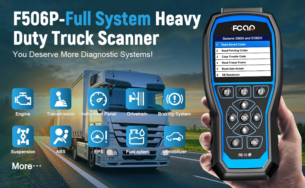 ➤【Широкое применение 】 HD Грузовики: для Freightliner, для Fuso, для GMC, для Hino, International, для Isuzu, для Iveco, для Kenworth, для Mack, для Mercedes, Для Nissian UD,Peterbilt, стерлинговое Серебро, для Western Star, для Volvo, для Allison, для Bendix, для Eaton, для Wabco, Для ZF и т. Д. И все автомобили/мин фургоны/светильник с 1996 года. Считыватель кодов F506 Pro может также использоваться как универсальный считыватель кодов OBD II для чтения и стирания кодов на БД-системе других марок.