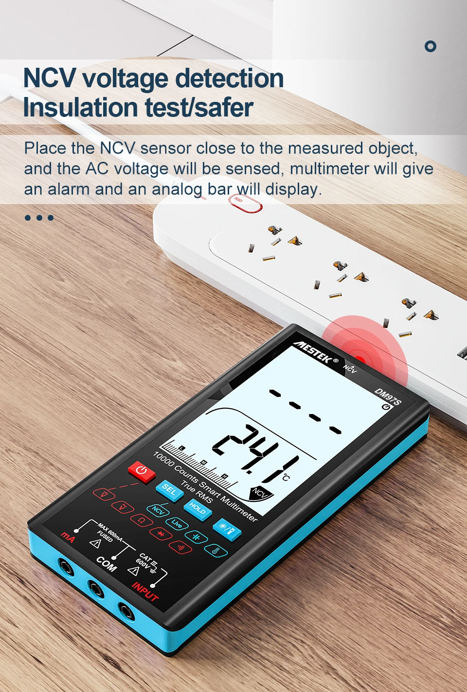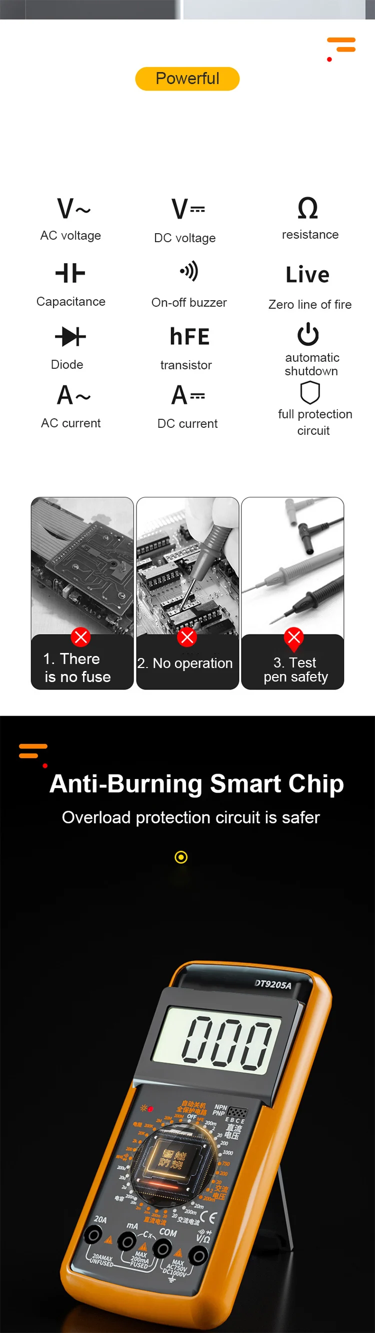 5. Функция измерения чрезвычайно богата, может не только измерять напряжение, но и измерять ток, а также другие функции, такие как сопротивление, емкость, частота, диод, NCV и т. д.;