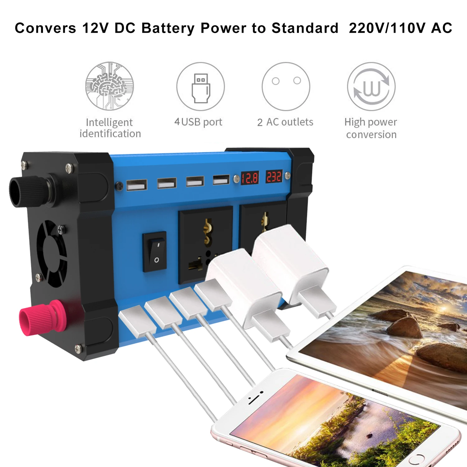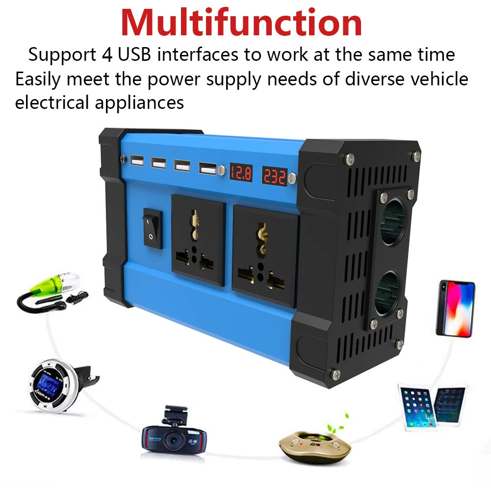 Two Internation Universal AC Outlets and support four usb charger ports 3.6A to work at same time and it can offer 100% fast charging for Mobile phones, computers, laptop,breast pump, Nebulizer, Razors, medical rescue device, emergency equipment etc. Easily meet the power supply needs of the diverse vehicle electrical appliance and it can be as a Emergency Power Supply.