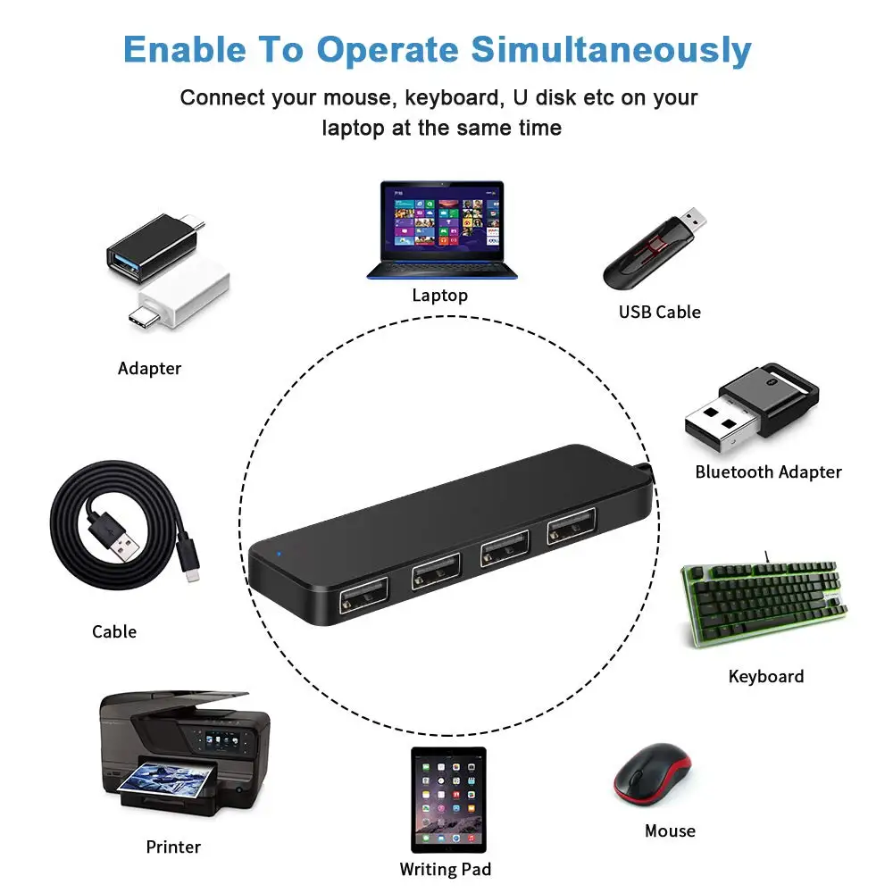 【 4 USB 2.0 порт s】 Увеличьте один супер-скоростной USB 2.0 порт до четырех. Одновременное подключение до четырех USB-A периферийных устройств.