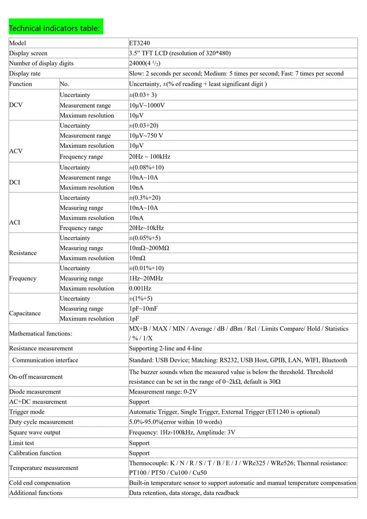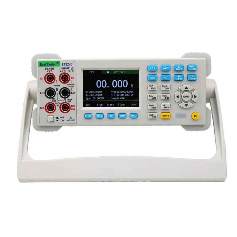 ET3240-это 4 цифры, 22000 отсчетов, двойной цифровой настольный мультиметр true-RMS. Чип STM32 и внешняя двойная Интегральная реклама, используемые этим настольным мультиметром, обеспечивают точное измерение и стабильную производительность. 3,5 дюймов 320*480 с высоким разрешением на тонкопленочных транзисторах на тонкоплёночных транзисторах ЖК-дисплей экрана делает четкого восприятия информации, богатого дисплея, а также отлично визуальные эффекты. Настольный мультиметр питается от электричества и обеспечивает полную защиту от перегрузки. Свежий и простой дизайн с отличной производительностью делает их идеальным выбором для электриков, энтузиастов электроники, инженеров и колледжей и вузов.