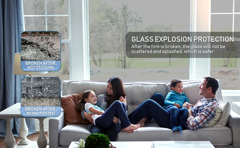 Простота в использовании: статическая пленка, применимая к любой гладкой или плоской стеклянной поверхности, такой как окно, раздвижная дверь, балкон, защищая стекло от повреждений.