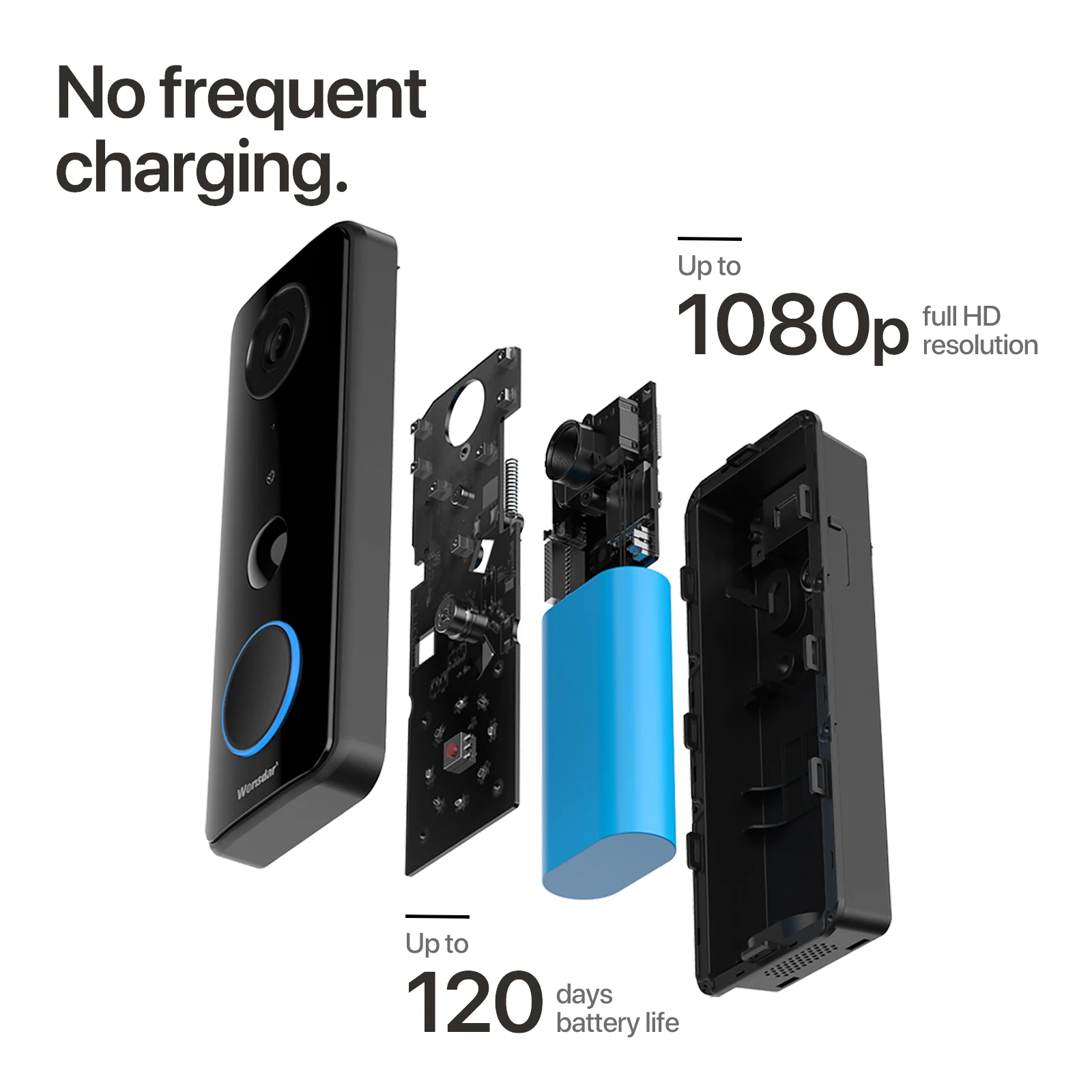Wonsdar видео дверной звонок потребляет особенно мало энергии, когда Обнаружение человека и сигнализация не срабатывают. Он почти не дает Ложные сигналы тревоги из-за обнаружения движения PIR и зон смарт-сигнализации, что делает его имеет длительный срок службы батареи.