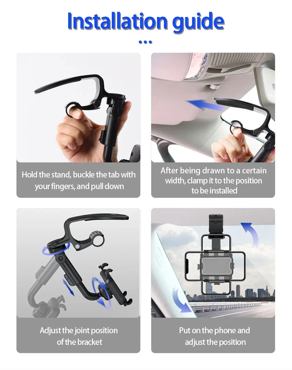 3. Держатель мобильного телефона с вращением на 360 °: Автомобильный держатель для телефона поддерживает вращение на 360 градусов, переключение между горизонтальными и вертикальными экранами по вашему желанию. Три вращающиеся шарниры, без мертвых углов. Дает вам легкое и безопасное вождение.