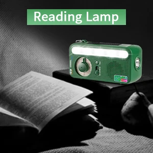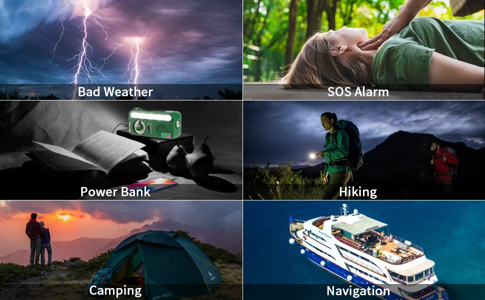 5 in 1: FM Radio, LED Flashlight, Reading Lamp, SOS Alarm, Power Bank.
