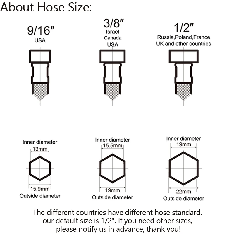 Примечание:Разные страны имеют различные стандарты шланга. Наш размер по умолчанию составляет 1/2 дюйма. Если вам нужны другие размеры, пожалуйста, сообщите нам заранее, спасибо!