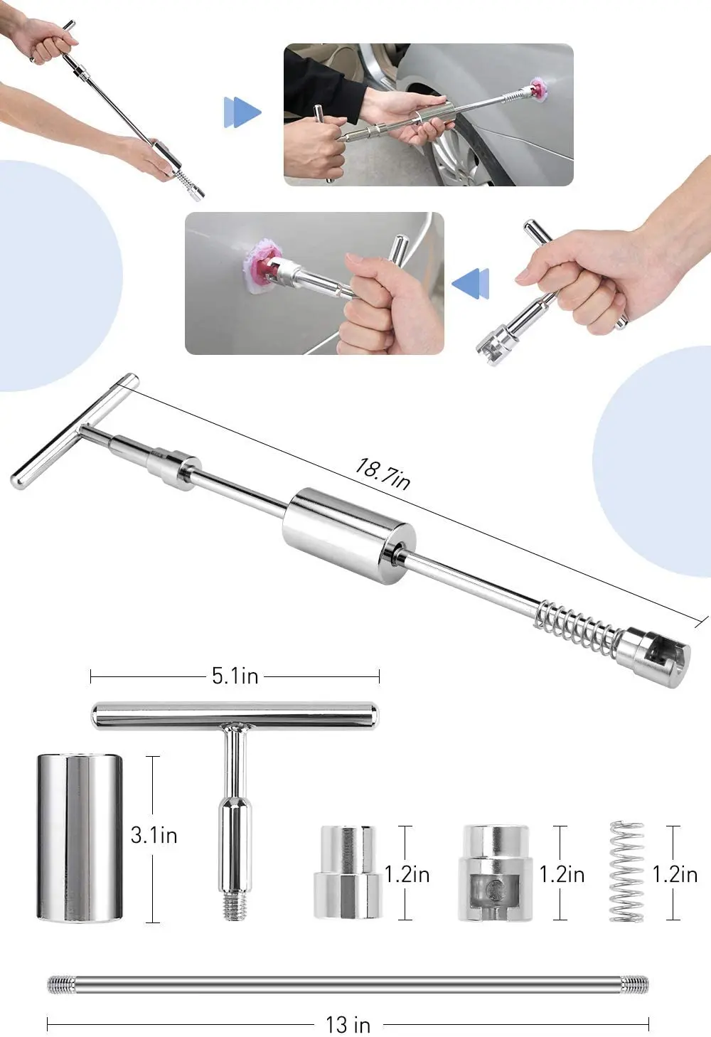 Т-бар Dent Puller Kit: Этот T-бар Dent puller очень подходит для больших вмятин и может быть разобран в короткий T-бар puller. Это просто и быстро, подходит для маленьких вмятин и длинных вмятин, и является эффективным и экономичным.