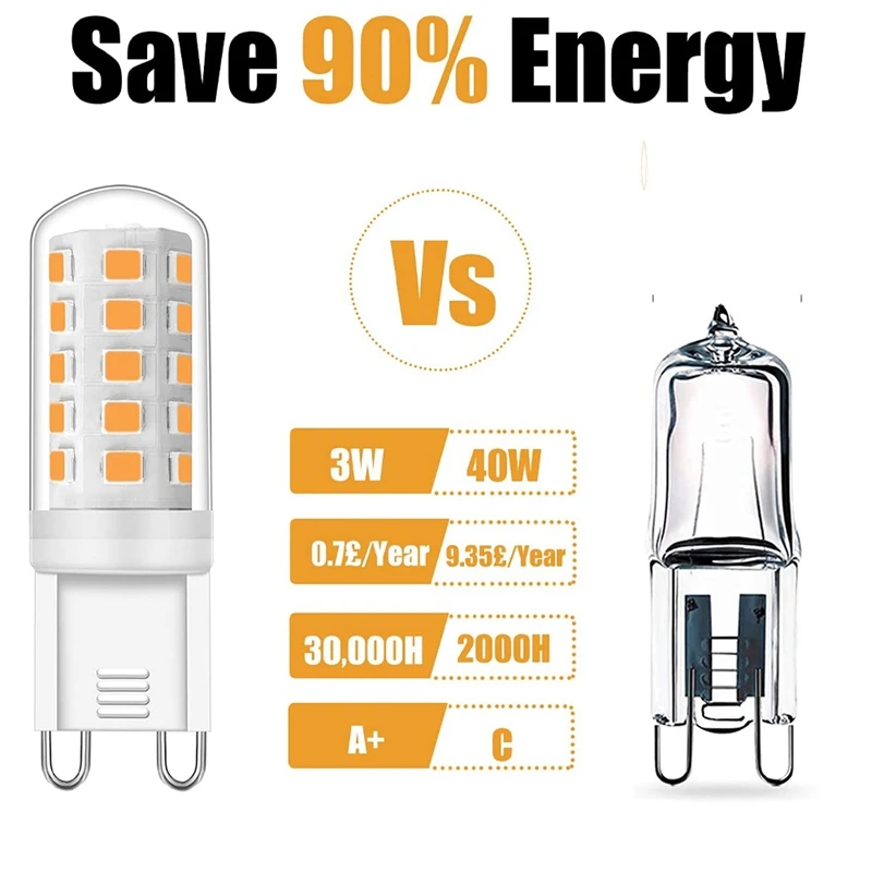 Энергосбережение A +: G9 led 3 Вт (замена галогенных ламп 28 Вт 33 Вт 40 Вт), 410 люмен, экономия 90% электроэнергии.