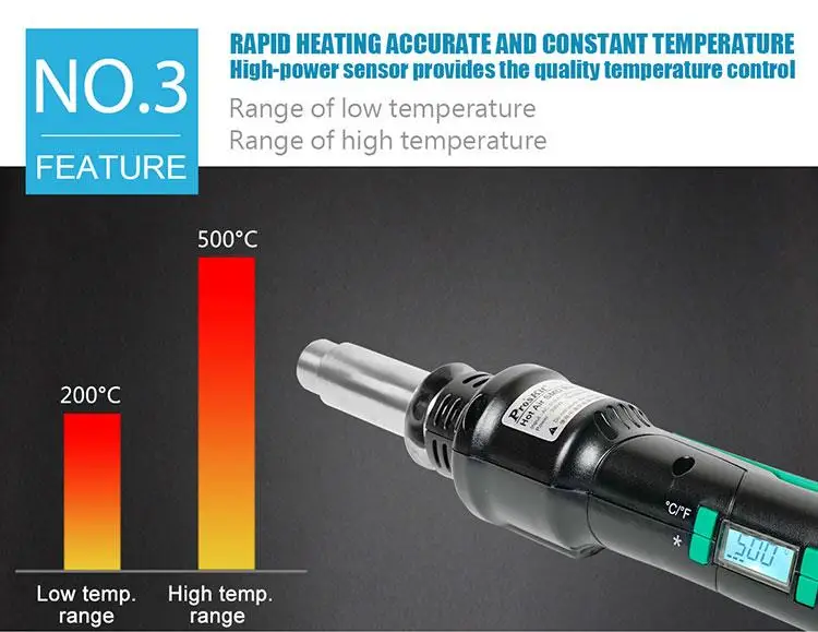 Температура регулируется от 200 °C до 500 °C.