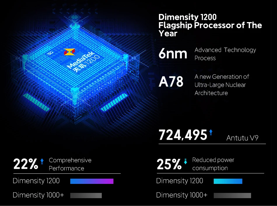 Процессор------------- MTK Dimensity 1200 Octa Core Процессор, до 3,0 ГГц