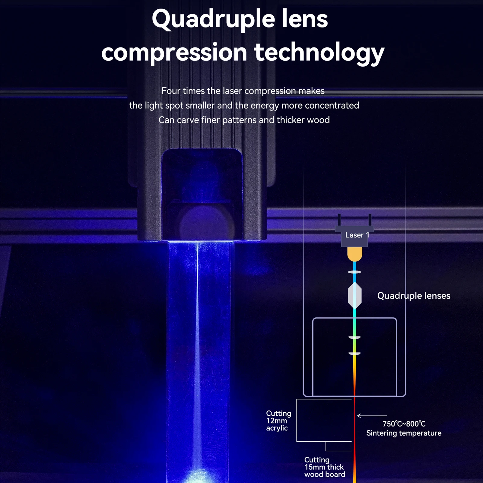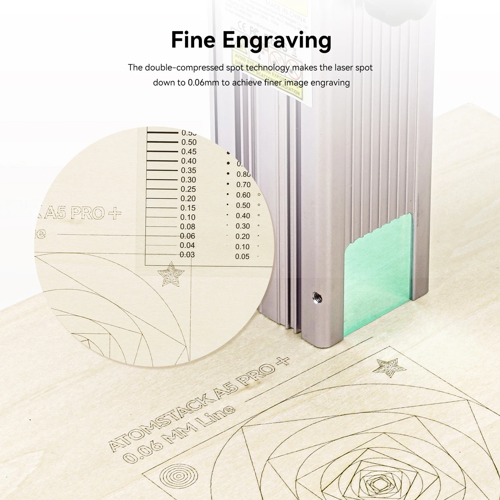 Новый модернизированный ультра-тонкий сжатия лазера: лазер принимает 4 раза группы линз коллизацией и технология фокуса, оптическая мощность составляет 5,5 Вт, и лазерный фокус зона сведена к 0.02mm м². Лазер высокой плотности может легко отрезать 15 мм толстые деревянные доски, 12 мм черный акрил; Может непосредственно гравировать зеркало из нержавеющей стали металла и керамики.