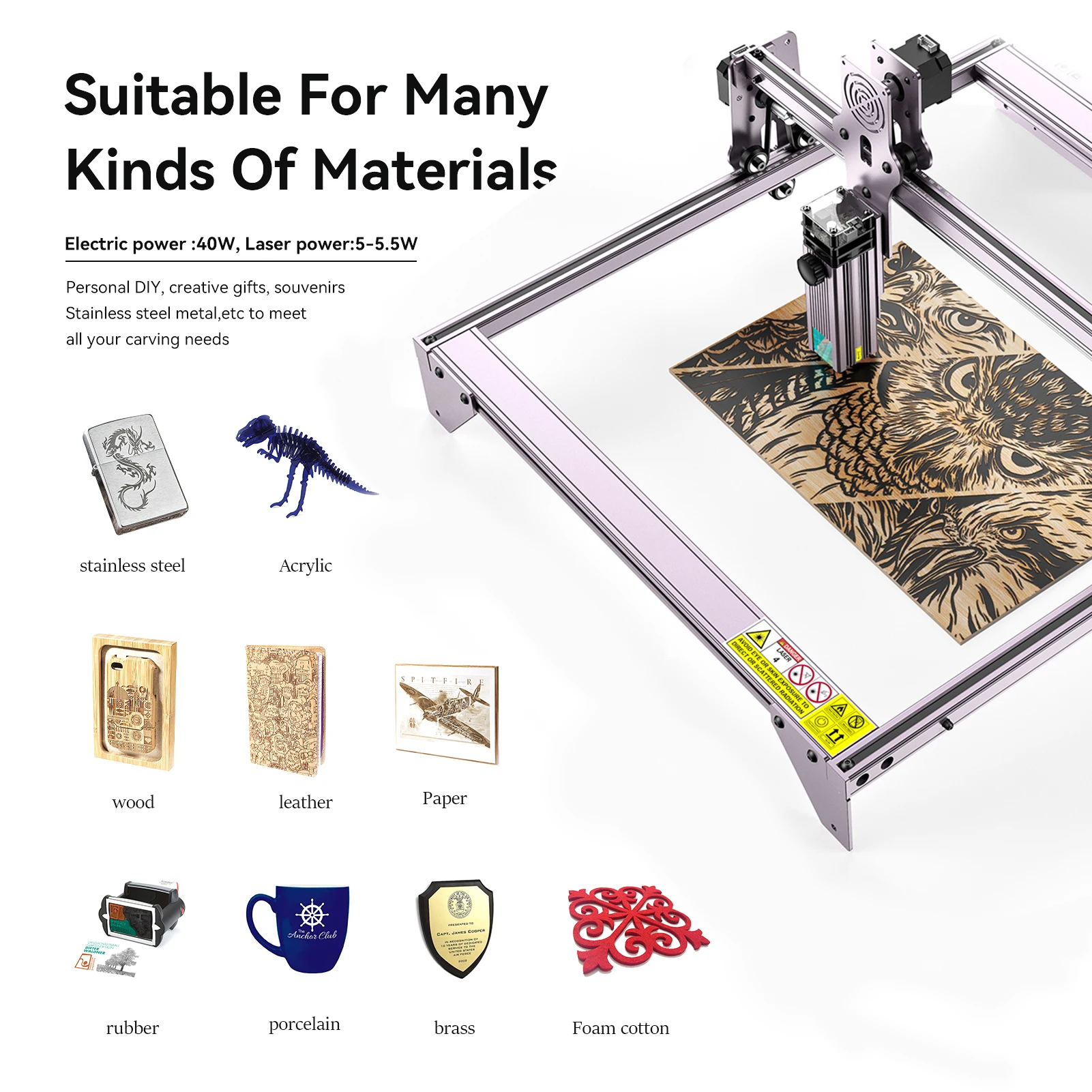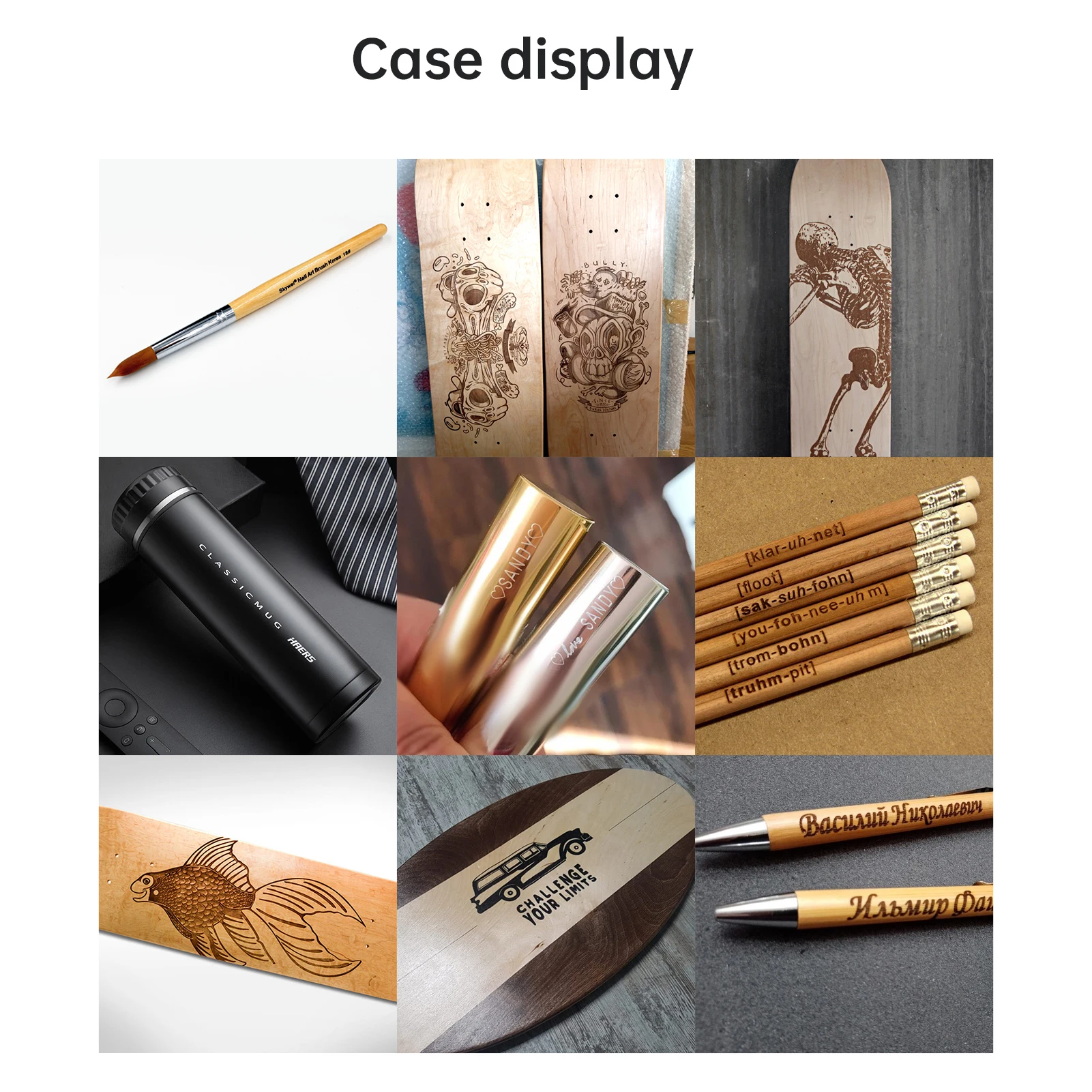Предметы для резьбы: дерево, бамбук, картон, пластик, кожа, печатная плата, оксид алюминия, антибликовый гальванический слой и поверхностный слой краски металл, 304 зеркальная нержавеющая сталь, стекло, керамика, хлопковая ткань, сланец;
