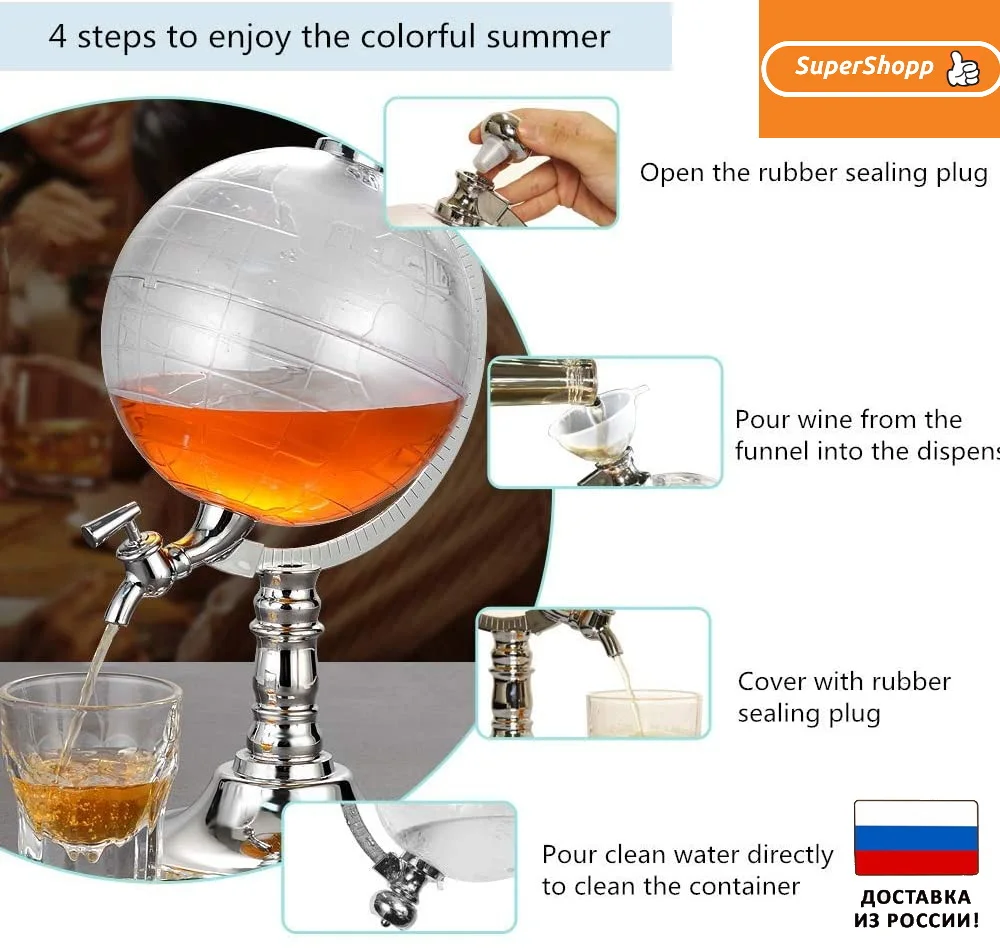 Как пользоваться: Верхняя часть глобуса - крышка. Она открывается, в глобус наливается напиток,