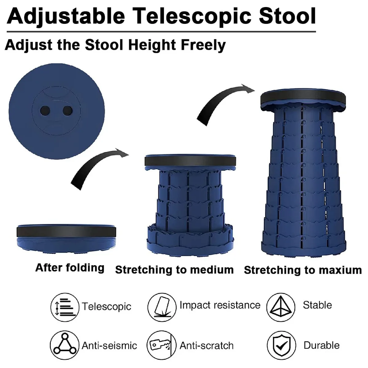 -Широкое применение: Выдвижной стул идеально подходит для использования в помещении и на открытом воздухе. Домашние мероприятия, такие как гостиная, спальня, ванная комната, горы, кухня, пляж, бассейн, офис; Мероприятия на свежем воздухе, такие как кемпинг, рыбалка, охота, туризм, барбекю, пикник, очереди, садоводство, И т. д.