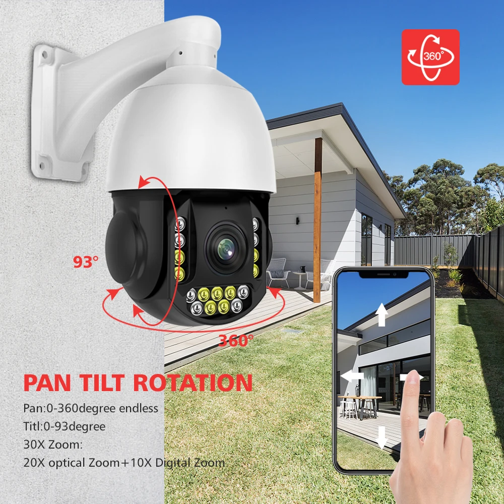 Камера будет регулировать панорамирование/наклон вращения и масштабировать автоматически, захватывая четкие цели мониторинга и автоматическое отслеживание движения человека, а также push-оповещения по электронной почте или уведомления на телефон.