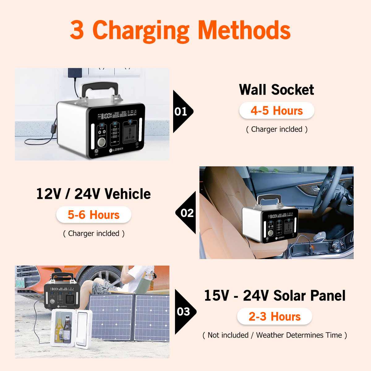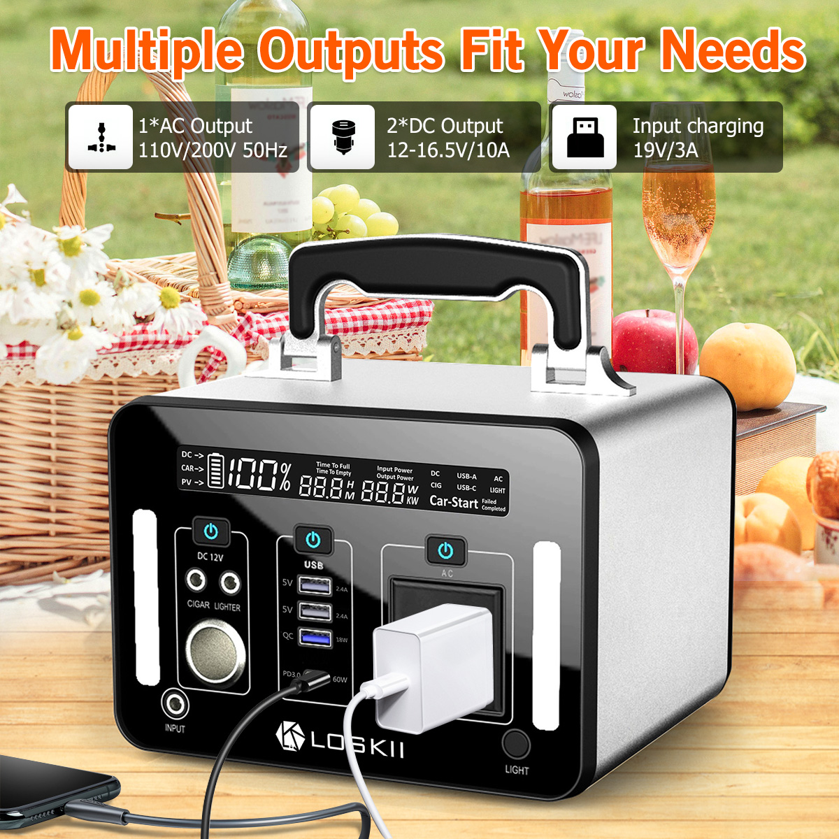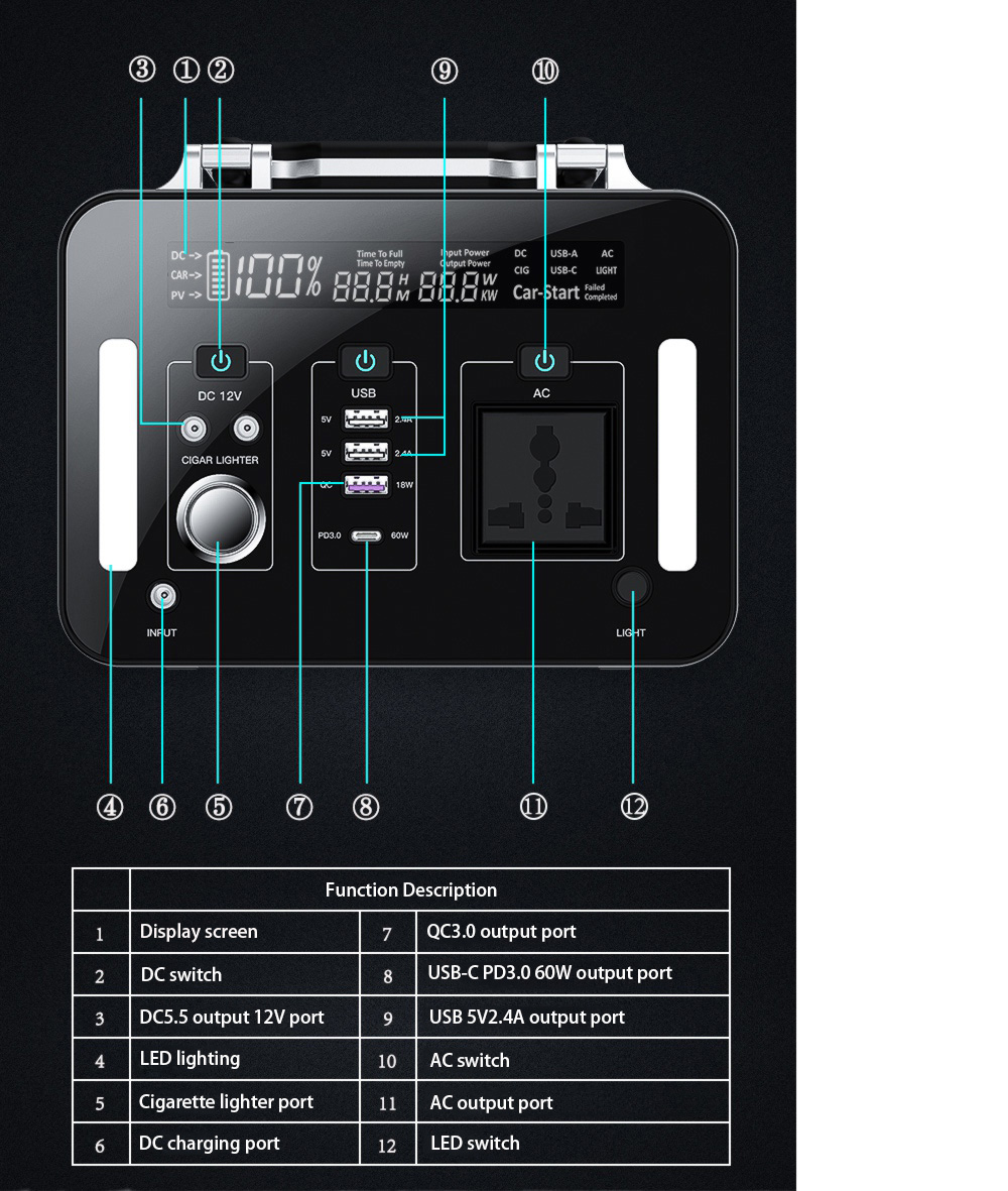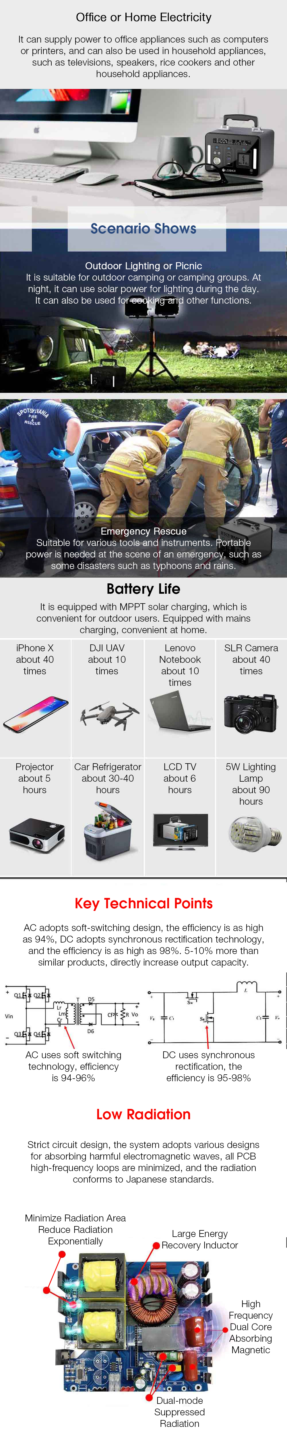 ● Способы зарядки: вы можете использовать розетки переменного тока, зажигалку на вашем автомобиле и солнечную панель (не входят в комплект) для зарядки этой литиевой электростанции, когда розетка недоступна, на ЖК-дисплее показана пропорция тока зарядки и мощность зарядки.