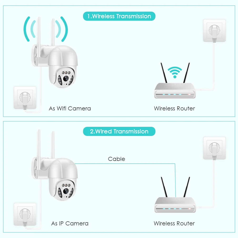 Питание от адаптера DC12V, вы можете подключить камеру к сети Wi-Fi. Вы можете настроить Wi-Fi соединение камеры или поиск по локальной сети с помощью сетевого кабеля, подключенного к роутеру, работать только с 2,4G wifi (не поддерживает 5G)