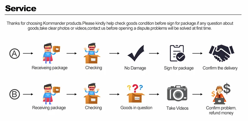 Пожалуйста, сначала свяжитесь с нами, мы будем отслеживать ваш товар. Если вы не можете получить его, мы полностью вернем Вам деньги или отправим его повторно. Мы честный продавец, поэтому не волнуйтесь.