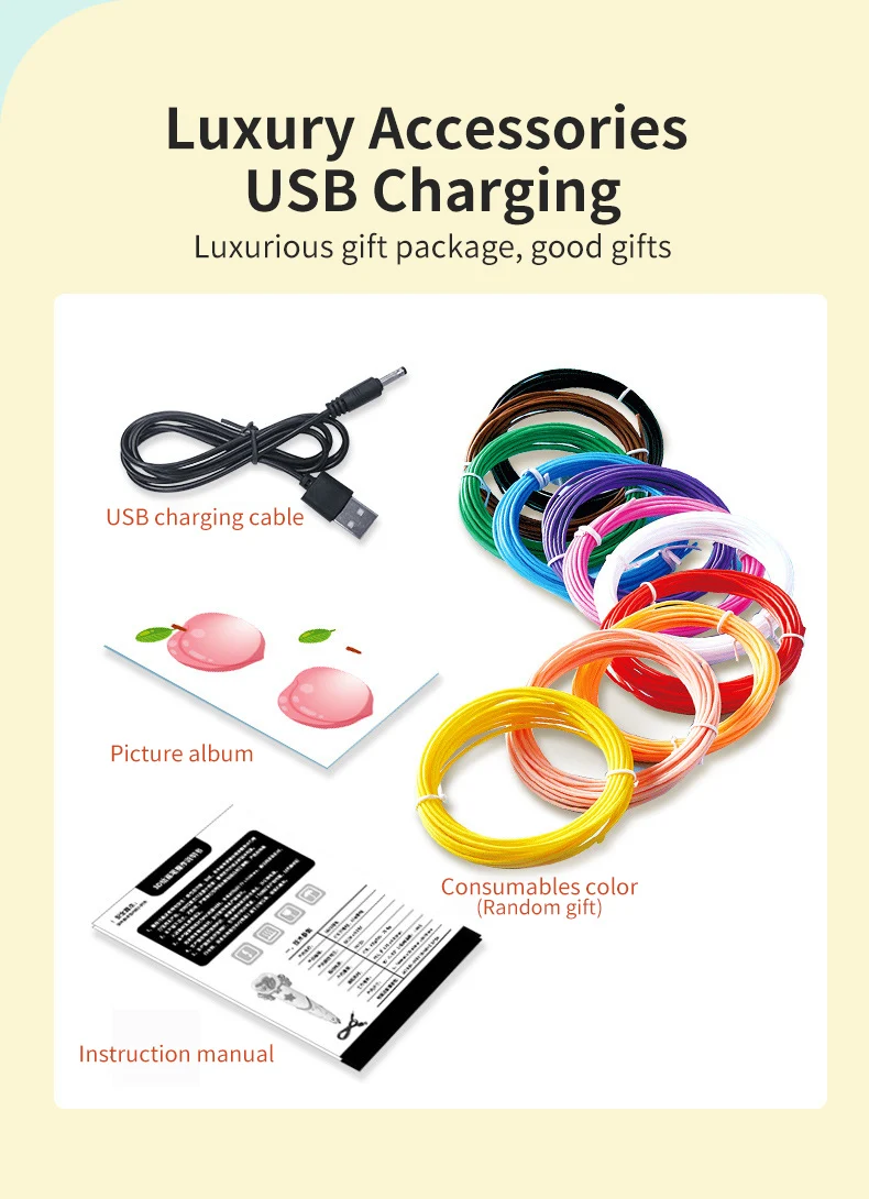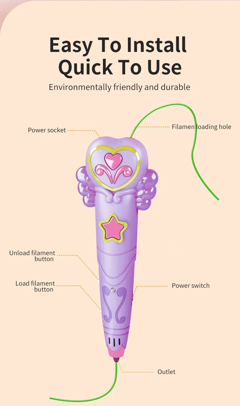 Разработан с низкой температурой, который может быть окрашен на кожу, что решает проблему традиционных высокотемпературных ручек для печати, которые сжигают пальцы при высокой температуре. И наши 3d-ручки являются беспроводными, более удобными и практичными.