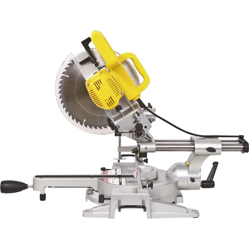 Пила торцевая (торцовочная) электрическая Калибр ПТЭ-1900/255ПРм предназначена для выполнения прямых, боковых и косых распилов и резов в древесине, ДСП, ДВП, пластмассах. Заготовка на рабочем столе может быть повёрнута на угол от 0 до 45° за счёт поворотного основания. На основной рукоятке пилы расположены: рычаг блокировки защитного кожуха и клавиша выключателя. Конструкция пилы позволяет осуществлять: распиловку материала под заданным углом от 0 до 45° относительно задней кромки заготовки в обе стороны, заданным углом от 0 до 45° относительно вертикальной оси влево и продольного пиления при перемещении вдоль направляющих. Металлическая станина пилы устанавливается на ровную горизонтальную поверхность. Для крепления пилы на верстаке (рабочем столе) в ножках станины имеются 4-е крепёжных отверстия. При пилении длинных заготовок в станину крепятся 2-е дополнительные опоры. Распиливаемая заготовка плотно прижимается к параллельному упору и крепится к рабочему столу струбциной. Для отвода стружки в комплект поставки входит пылесборник, который крепится к патрубку неподвижного кожуха. К патрубку можно подключить промышленный пылесос. На суппорте вертикального перемещения пилы расположен блок лазер, подсвечивающий линию реза при пилении. Электрическая схема пилы имеет дроссель плавного пуска, что облегчает запуск двигателя. В комплект поставки входят: пылесборник, щётки графитовые, а также дополнительные опоры для распиливания длинных заготовок.