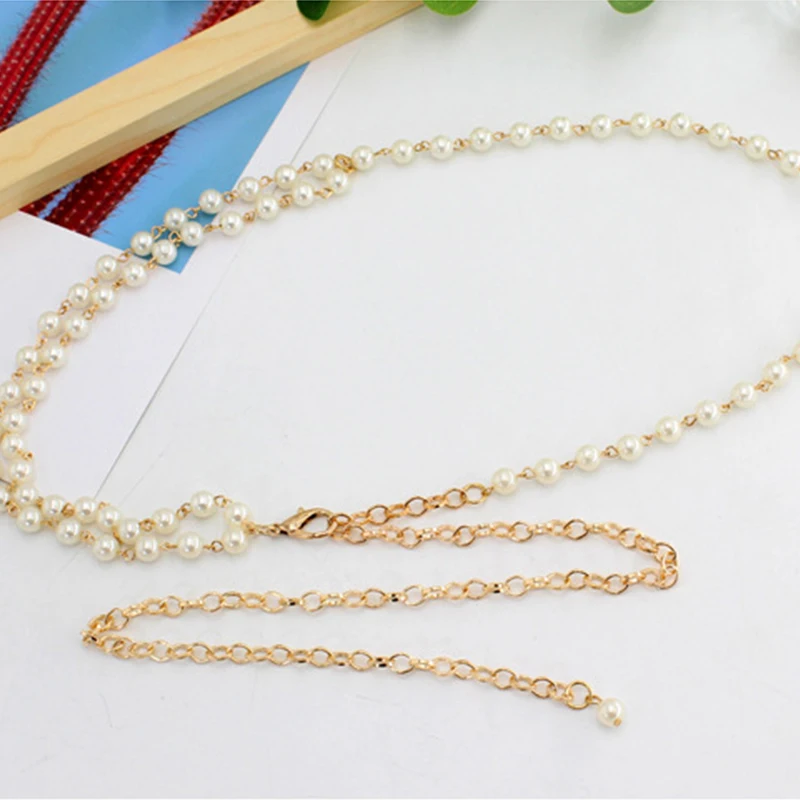 Тонкий длинный пояс с жемчугом для женщин, элегантный пояс с металлической цепочкой золотого цвета, регулируемый пояс для платья