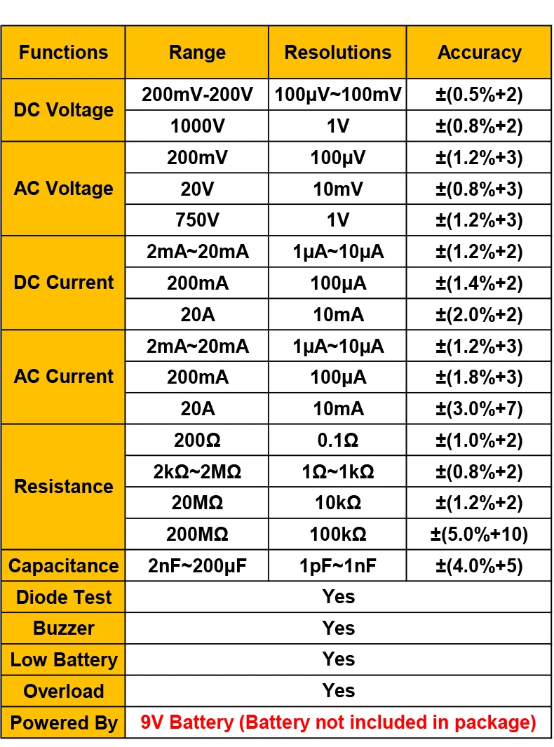 ●Питание: 6F22 9V Батарея (Батарея не прилагаются во время упаковки)