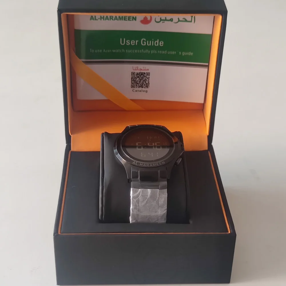 Уникальный блестящий черныйТолщина 10 ммХиджри и григорианский календарьДва языка (английский и Арабский)Коран ЗакладкаAzan times для большинства городов по всему миру с направлением QiblaЕжедневная сигнализация* Коран ЗакладкаЭта функция используется для записи последнего имени суры и номера стихов, которые вы достигли при чтении Корана* Девять систем taqweem запрограммированы в часахAL-HARAMEEN использует местную taqweem или наиболее широко используемую систему taqweem для вашего города. Другие стандартные системы taqweem доступны следующим образом:*(DF) Local taqween• H) Выбор метода Hanafi для ASR• F: 15 Umm al-Qura taqweem• F: 18 Umm al-Qura taqweem• F: 19 Umm al-Qura taqweem• 18,17 мусульманская мировая Лига (мусульманская лига)• 19:17 Египетский таквеем (Египет)• 18: 18 Исламский университет в Карачи (Hanafi taqweem)• 15:15 ИСЛАМСКОЕ ОБЩЕСТВО Северной Америки (ISNA)• 1:30 фиксированное времяFajr время определяется как фиксированный интервал времени до времени shrooq. Время Isha определяется как фиксированный интервал времени после Magrib azan. Эта система используется в Северной Европе.* Следующий Iqamah (время отдыха, чтобы молиться)Следующие Iqamah с двумя способами, как показано ниже:1. Если вы установите минуты до Iqamah, часы будут записывать время отдыха до Iqamah с тех минут, которые вы установите до 0.2. Если вы не настроите минуты на Iqamah, Часы будут записывать минуты после azan от 0 до 30.* Автоматическая сигнализация Iqamah для всех молитвЭта уникальная функция напомнит вам каждый день точно в то же время относительно времени azan. Например, предположим, что вы установите будильник молиться 12:15 вечера, а ZUHR azan-в 12:00 вечера. На следующий день, если ZHUR azan time станет 12:01 PM, то автоматически этот будильник изменится на 12:16 PM. В этот чехол, вы будете просыпаться через 15 минут после того, как ZHUR времени азана каждый день.ДатаЖур азанZUHR сигнализация1 мая12:00 PM12:15 PM2 мая12:16 PM12:15 PM автоматически изменяется на 12:16* Ежедневные сигналы тревогиСигнализация 1 и сигнализация 2, эти два повседневных будильника являются обычным сигналом, который звонит в то же время каждый день.* Направление QiblaНаправление Qibla (по отношению к северу) может быть отображено.Угол Qibla также будет отображаться между 0 и 360 градусов, по часовой стрелке с северной стороны.* Хиджри и григорианские календари:Календарь григориана или хиджри может быть отображен.Календарь хиджри следует за григорианской датой и основан на астрономической Луне, видимой в Мекке.* EL задний светильник* Возможность отображения времени 12 (am/pm) или 24 часа* Можно легко добавить новый город (долгота, долгота и GMT информация)* Возможность сохранения дневного света (для стран, использующих эту систему)