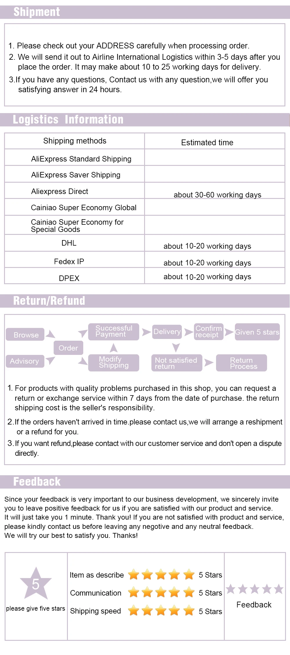 1. Due to the different monitor and light effect, the actual color of the item might be slightly different from the color showed on the pictures. Thank you!