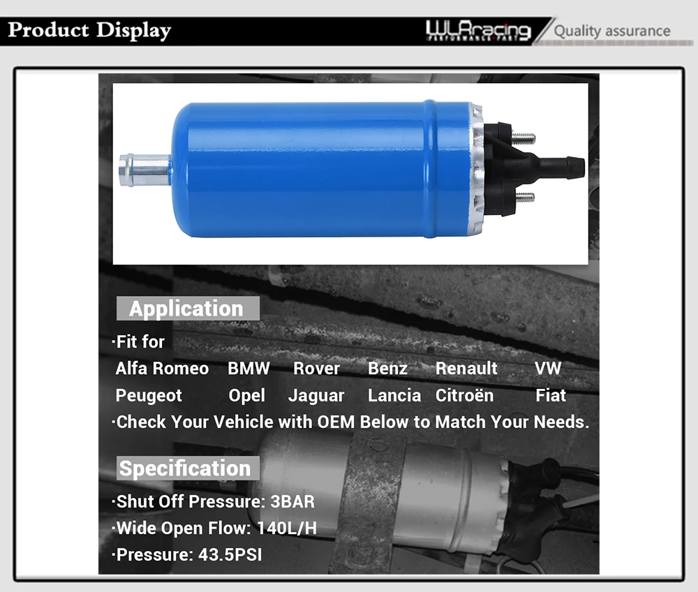 Для Alfa Romeo: 4421193, 4460210, 6081037, 7635535, 60521992, 60546091, 82308678, 605219920, 605460910, 116460102100, 119110402100, 547812, 4429209, 4460646, 7580213, 44606460, 60537611, 60810370, 82350177, 605376110, 11646010210, 116460402100, 11646010210000.Для Audi: 022906091, 251906091, 043906091, 311906091D.Для Остин: AUU1649.Для MG: AUU1649.Для Rover: AUU1649.Для BMW: 1118662, 1179231, 16121115862, 16141179231, 1115862, 1178751, 1179232, 16141178751, 16141179232.Для Chevy: 06443402, 52251521.Для Citroen: 145059, 547166, 5471660, 91539329, 9153880680, 145083, 5421733, 91538806, 9151404980, DX173900A.Для экскаватора Daewoo: 92927023.Для Eagle: T0722393.Для Fiat: 547812, 4429209, 4460646, 7580213, 44606460, 60537611, 60810370, 82350177, 605376110, 116460402100, 11646010210000, 4421193, 4460210, 6081037, 7635535, 60521992, 60546091, 82308678, 605219920, 605460910, 119110402100.Для General Motors: 815011, 90020443, 90292723, 815004, 9292723, 90167397, 90349944.Для Holden: 92017845, M41457, 90136950, 92145404.Для Iveco: 4460210.Для Jaguar: CAC2026, CAC4269, CFB5657, CAC2263, CBC5657.Для Lancia: 60521992, 60546091, 82277339, 82350177, 605219920, 605460910, 119110402100, 4421193, 4460210, 6081037, 7635535, 60537611, 60810370, 82308678, 82360177, 605376110, 116460402100, 11646010210000, 547812, 4429209, 4460646, 7580213, 44606460.Для Mercedes-Benz: 0010917101, A0010917101.Для Opel: 815003, 815004, 815005, 815006, 0815011, 8981872, 9292723, 90020443, 90167397, 90292723, 090349944, 92927023, 0815006, 815008, 815011, 8983625, 090020443, 90136950, 090292723, 90323006, 90349944.Для Peugeot: 145083, 5421733, 91538806, 9151404980, DX173900A, 145059, 547166, 5471660, 91539329, 9153880680.Для Piaggio: GU29107261.Для Porsche: 06309413306, 91435605501, 311906091D, 043906091, 91435605500, 92309490635.Для Citroen/Peugeot: 547166, 91538806, 9153880680, 145059, 5471660, 9151404980, DX173900A.Для Renault: 7700557763, 7700687710, 7700739914, 7701062086, 9153880680, TO722393, 6001008001, 7700582695, 7700722393, 7700855358, 9151404980, R100119328.Для грузовых автомобилей Renault: R100119328.Для сиденья: 043906091, 251906091.Для VAG: 022906091, 251906091, 311906091D, 043906091, 3059060911.Для Vauxhall: 815004, 815005, 815011, 0815011, 90020443, 9292723, 90292723, 90349944.Для Volvo: 241723, 6203543.Для VW: 002024398, 043906091, 305906091, 022906091A, 022906091, 251906091, 3059060911, 311906091D.Для Airtex: E10009.Для Claas: 6851490.Аккумуляторной топливной системы для Делфи: FE044812B1.ERA: 770005, 770096.Для Fispa: 70401.Для Hoffer:7506034.Для любителей: KSP9565001Для Kager: 520071.Для Klaxcar Франция: 44006Z.Для Lucas электрические: FDB700.Для Magneti Marelli: 219721287530.Для Maxgear: 430036.Для мяса и Doria: 76034.Для мессмер: 770005, 770096.Для Мецгер: 2250040.Для Meyle: 3149190000.Для Moto Guzzi: 11072310.Для MWM: 112392180983.Для патрона: PFP035, PFP107, PFP079, PFP110.Для Pierburg: 721287530.Для Sidat: 70401.Для Vemo: V40090003, V400900031.Совместимость с транспортными средствами таблицы служат исключительно в качестве справочных материалов. Проверьте ваш автомобиль с OEM ниже в соответствии с вашими потребностями. Размеры и материал:Входной диаметр: 12 ммВнешний диаметр: 8,5 ммОтключения давление: 3BARШироко открытой Пропускная способность: 140L/чДавление [пси]: 43,5Изготовлен из высококачественного алюминияОсобенности:100% Brand new никогда не использовался или не установленMont в заднем центре автомобиля или грузовика.Может быть установлен вместе с высокой производительностью walbro топливный насос или самостоятельно.Положительной клемме-M6, клемма заземления-M5.Посылка включает в себя:1 x Внешний топливный насос2 х резиновая Соединительная крышка2 x зажимы2 x гайки2 x шайбы Все предметы являются совершенно новыми, если не указано иное в списке.Мы продаем DIY (сделай сам) товары с несколькими, за исключениемS.Мы не несем никакой ответственности в научить вас, как установить.Профессиональная установка настоятельно рекомендуется.