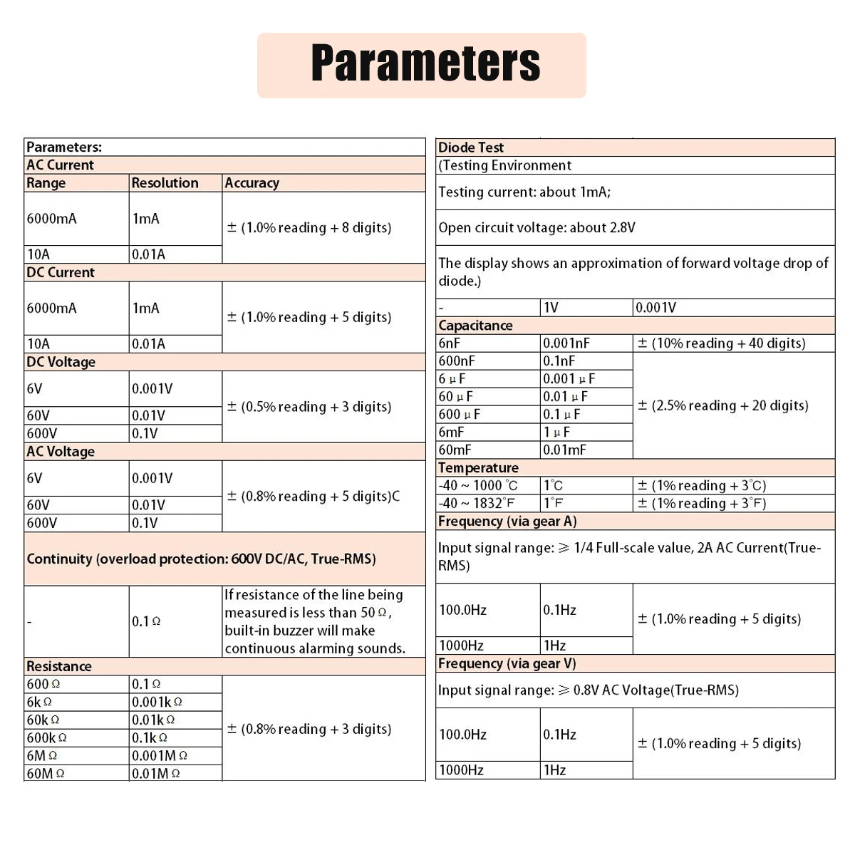 Непрерывность (защита от перегрузки: 600V DC/AC, True-RMS)