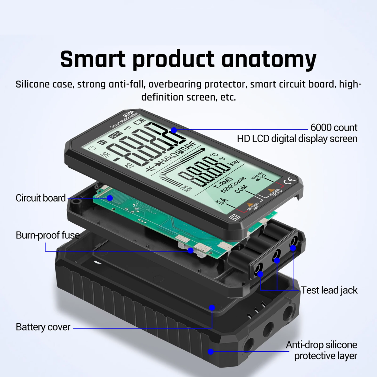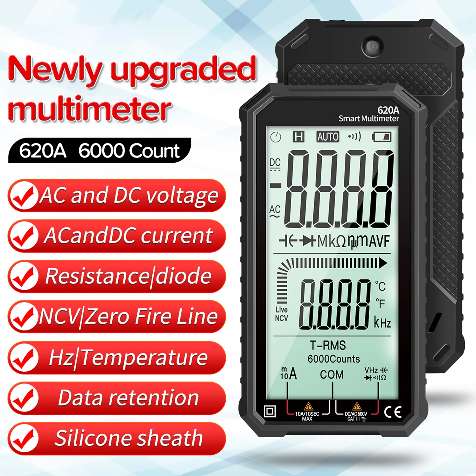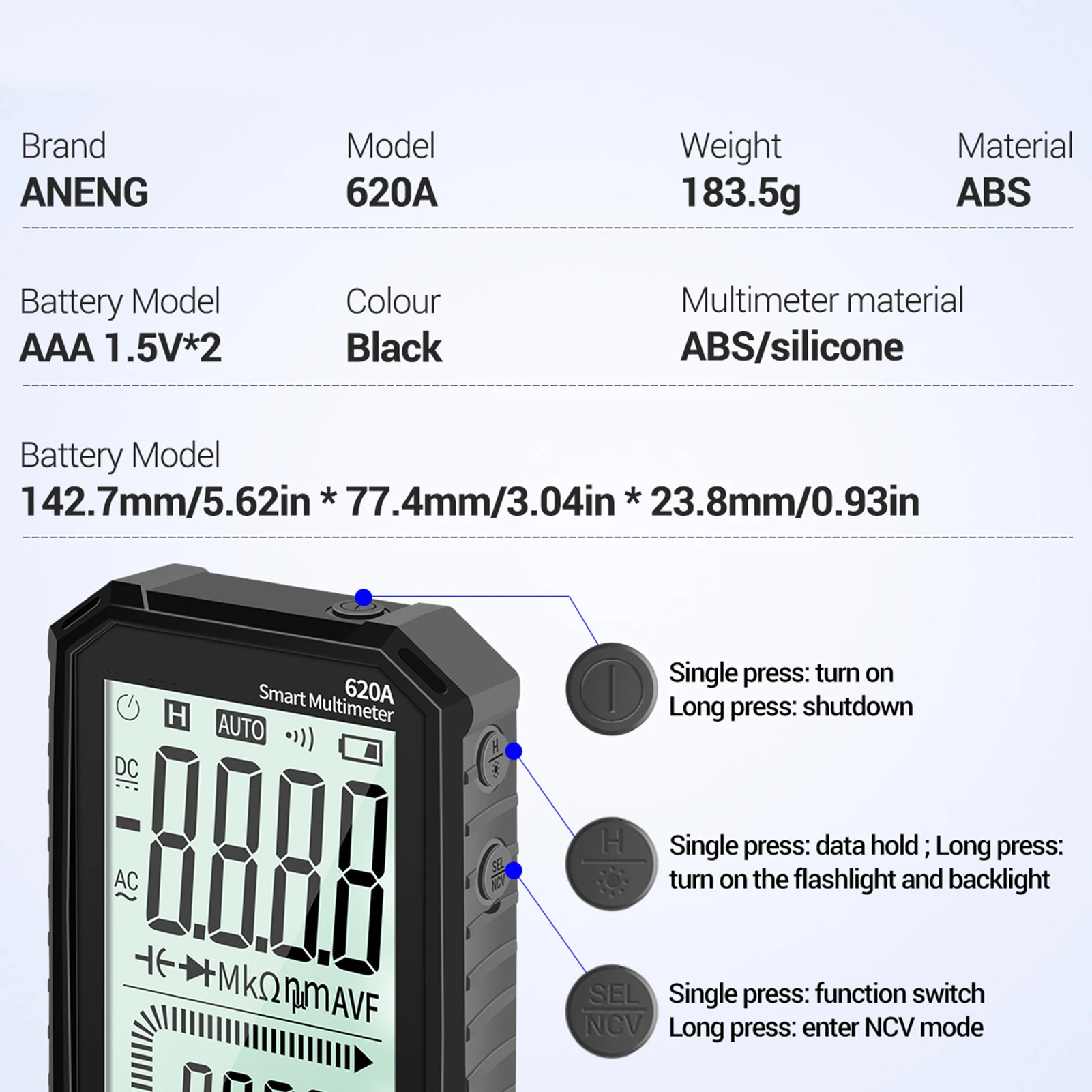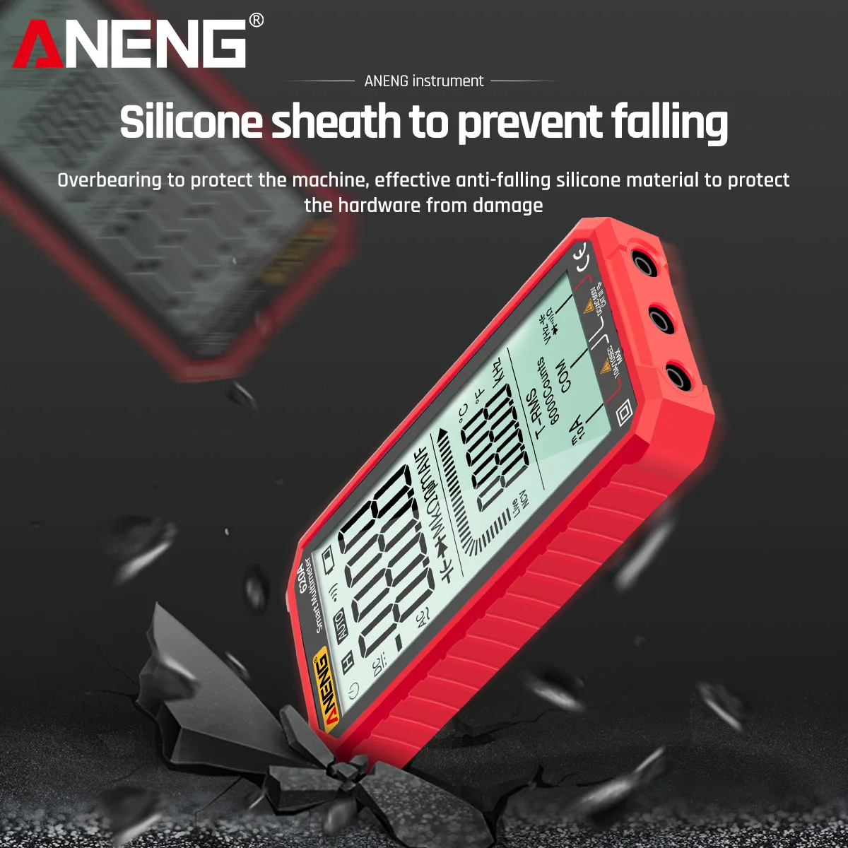 Карманный мультиметр ANENG отличается размером ладони, большим ЖК-дисплеем 4,77 дюйма, автоматическим диапазоном, истинным RMS, защитой от перегрузки, противоударным силиконовым покрытием и звуковым сигналом NCV. Он является ультрапортативным для обслуживания автомобилей, электроники, бытовой техники, ОВКВ и многого другого.