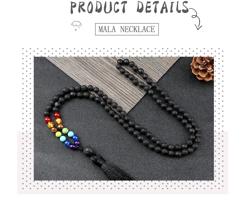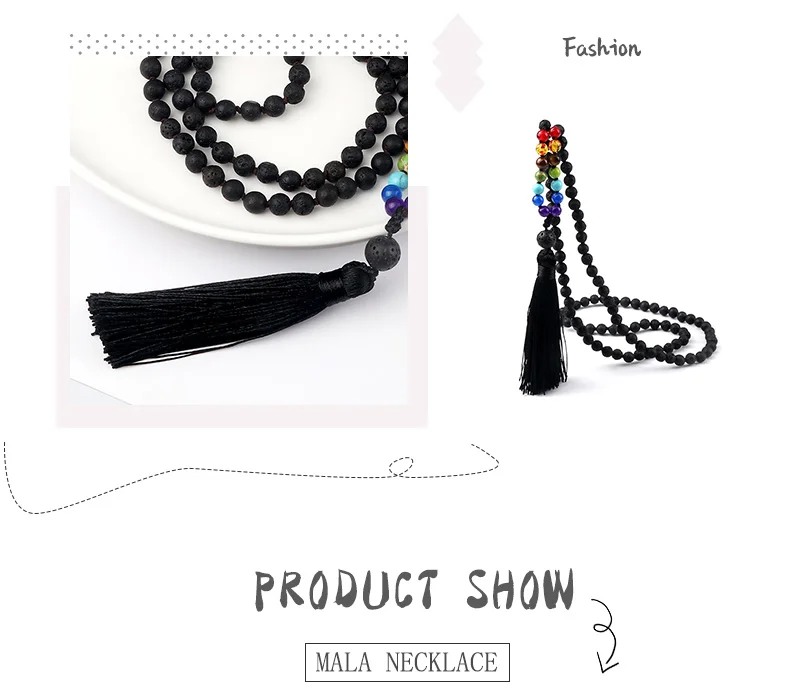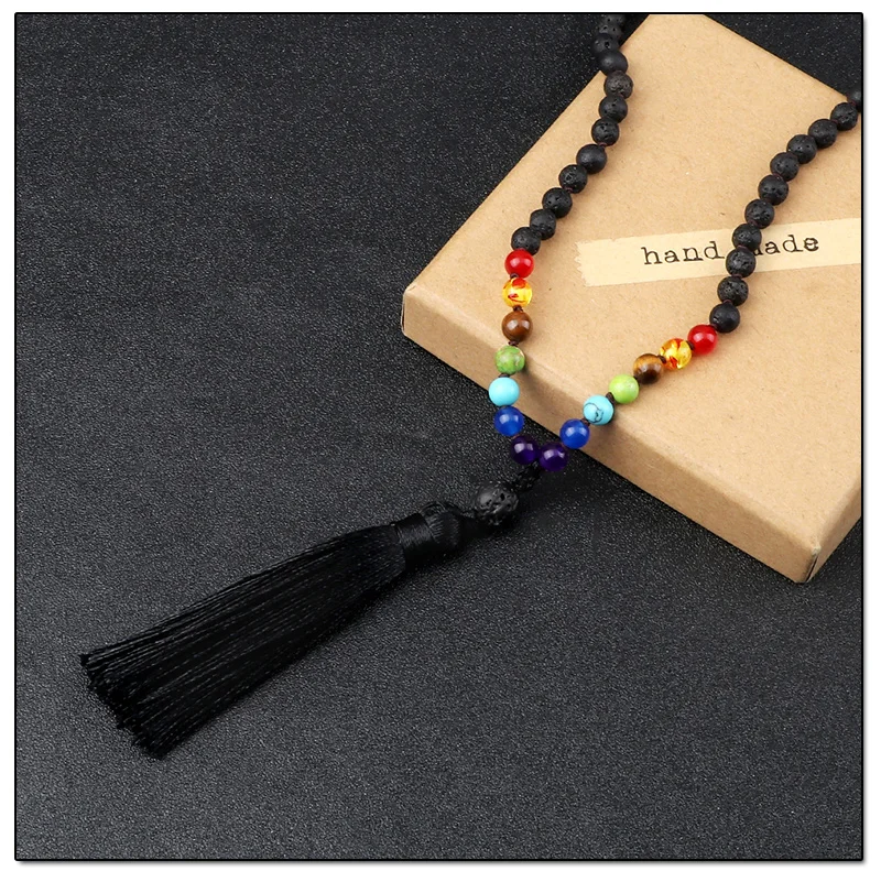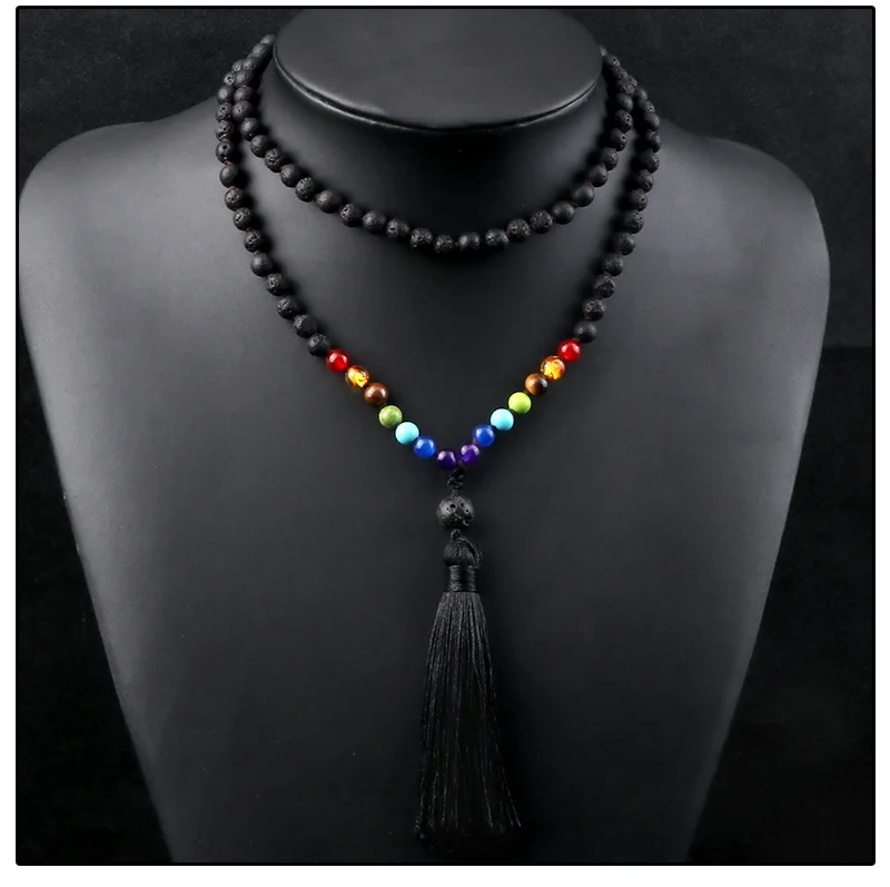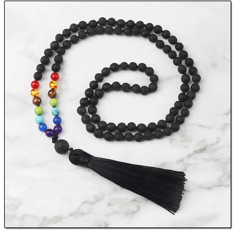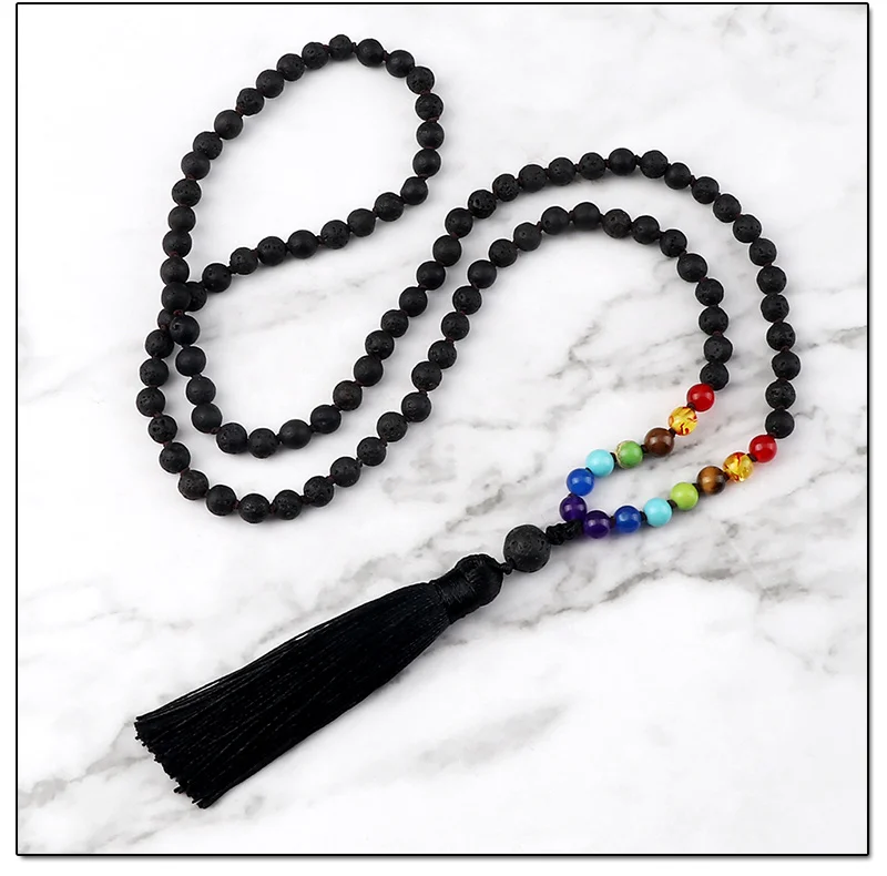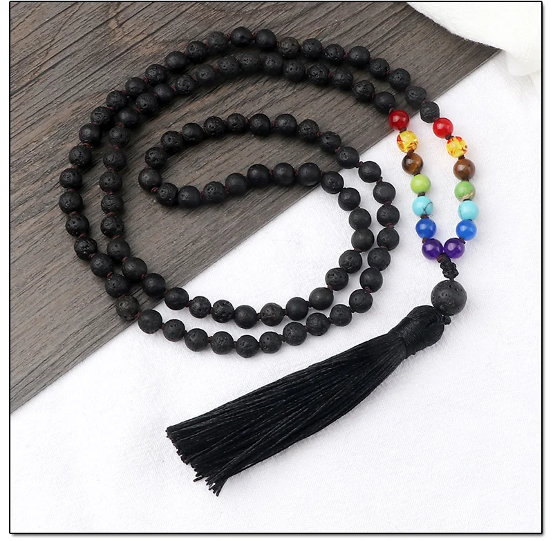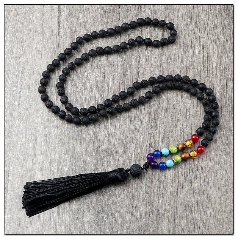 108 Mala 7 Чакра бусы узлом ожерелье 6 мм натуральный черный Лава камень медитация Йога кисточкой ожерелье Модные женские и мужские ювелирные изделия