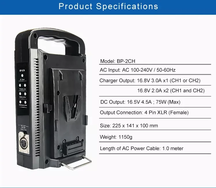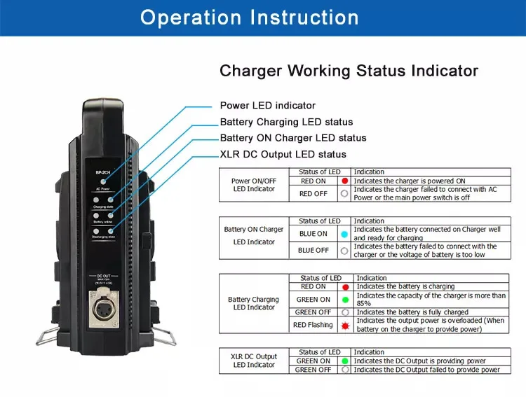 •Устройство может заряжать две батарейки одновременно, имеет 4-контактный разъём XLR Сделано в Китае DC выходной мощности, а также имеет встроенный емкость системы управления, мы обеспечиваем быструю зарядку беспроводны