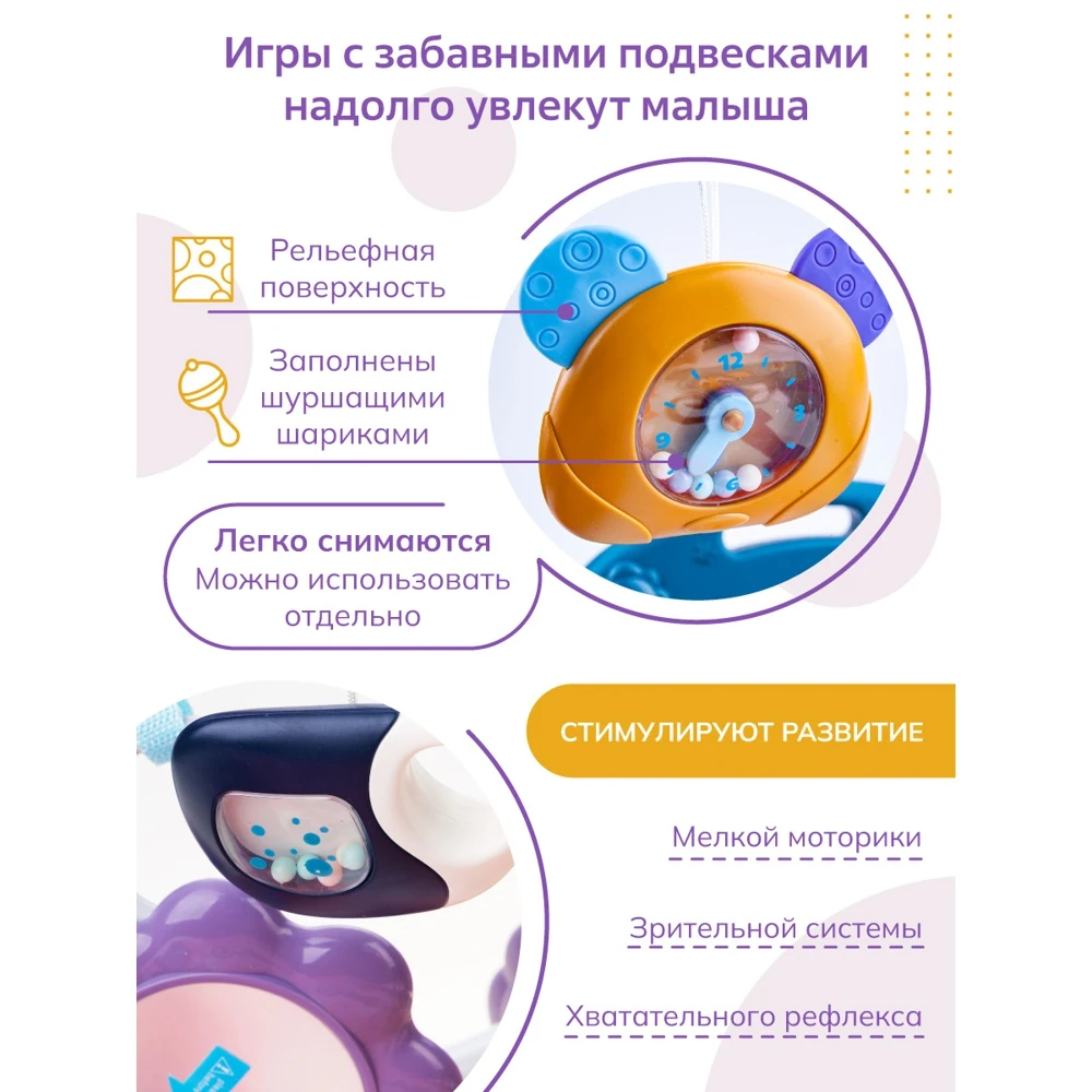 На развивающем коврике можно играть в трех положениях: на спинке, на животике или сидя. Малышу будет интересно тянуться за милыми игрушками, с помощью которых он будет изучать мир. Когда малыш научится сидеть, можно снять дуги и использовать коврик как мягкий и теплый пол для игр. Коврик способствует развитию мелкой моторики и служит средством тактильного восприятия. Яркий развивающий коврик с дугами и игрушками развивает умение наблюдать, концентрировать внимание и удерживать предметы в руках, а также цветовое и звуковое восприятие