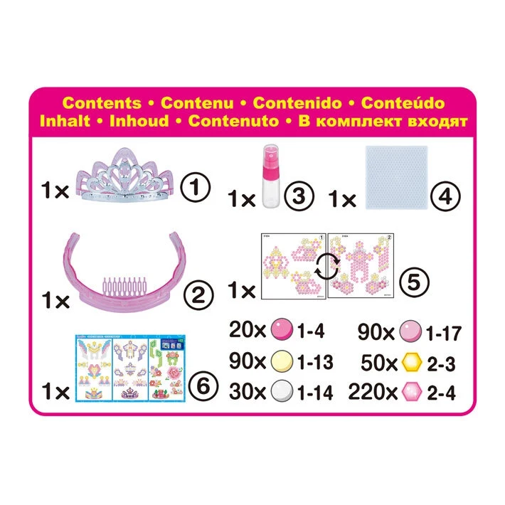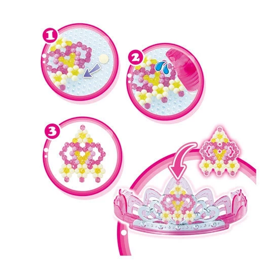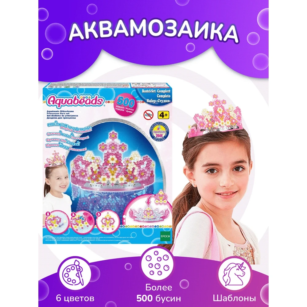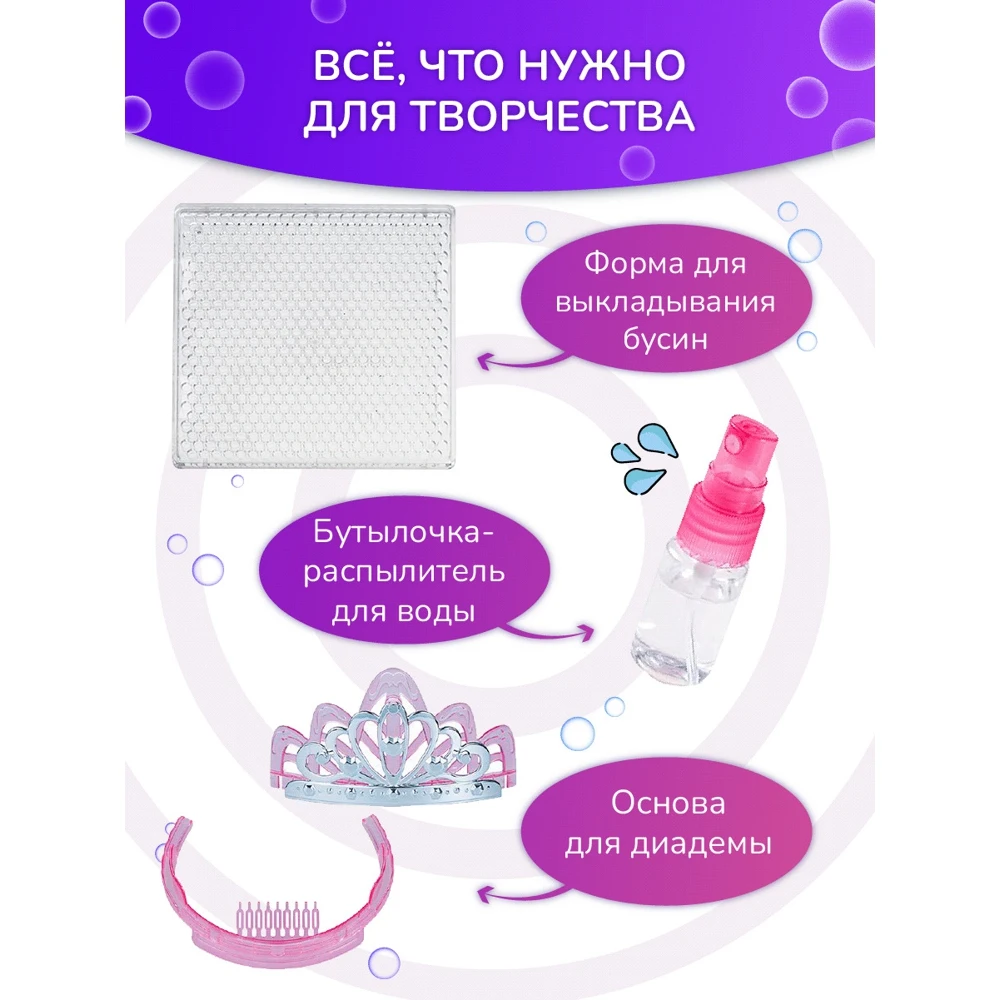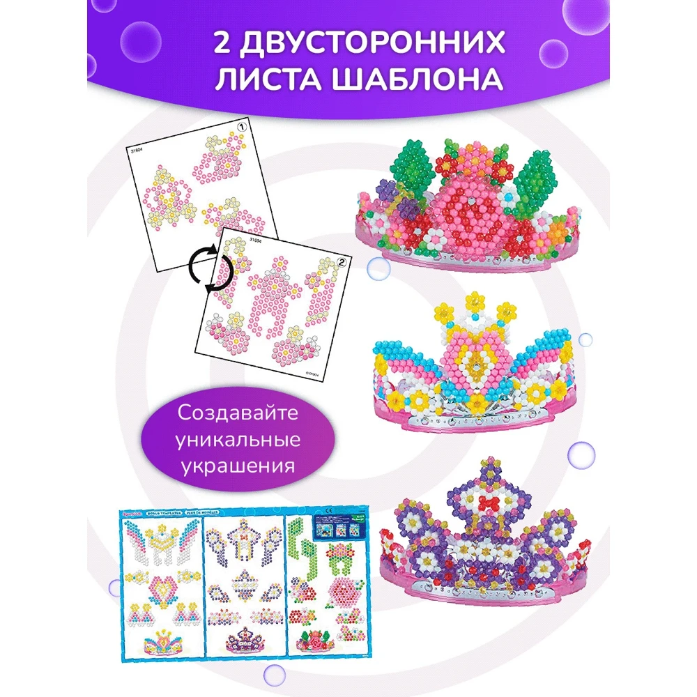 Набор Aquabeads Диадема для принцессы 3D как нельзя лучше подойдет для юных творческих особ. Он включает более 500 бусин. Бусины выкладываются на специальную форму по шаблонам, затем из бутылочки распыляется вода, и бусины соединяются как по волшебству. Готовые украшения из бусин устанавливаются на основу диадемы, которую маленькая принцесса потом сможет носить. При желании всегда можно поменять украшения из бусин, чтобы сделать яркую и красочную диадему, используя новый шаблон, которые уже входят в набор. - Бусины, вставленные в основание диадемы, можно заменять в любое время. - Диадема может быть выполнена в трех вариантах, если использовать шаблоны, которые идут в наборе. - Набор помогает раскрыть творческий потенциал ребенка и сделать красивое украшение. В комплекте: - Набор бусин 6 разных цветов. - Объемное основание для диадемы. - Бутылочка-распылитель для воды. - Шаблоны и макеты. - Инструкция.