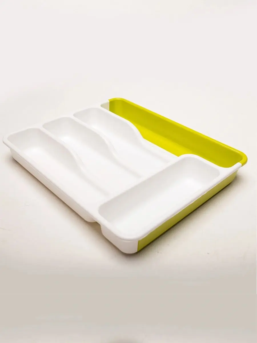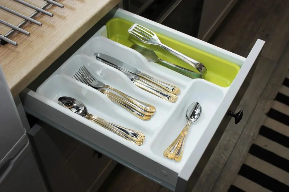 Раздвижной лоток для столовых приборов предназначен для хранения столовых приборов. Позволяет отрегулировать размер, чтобы полностью использовать полезное пространство кухонного ящика.