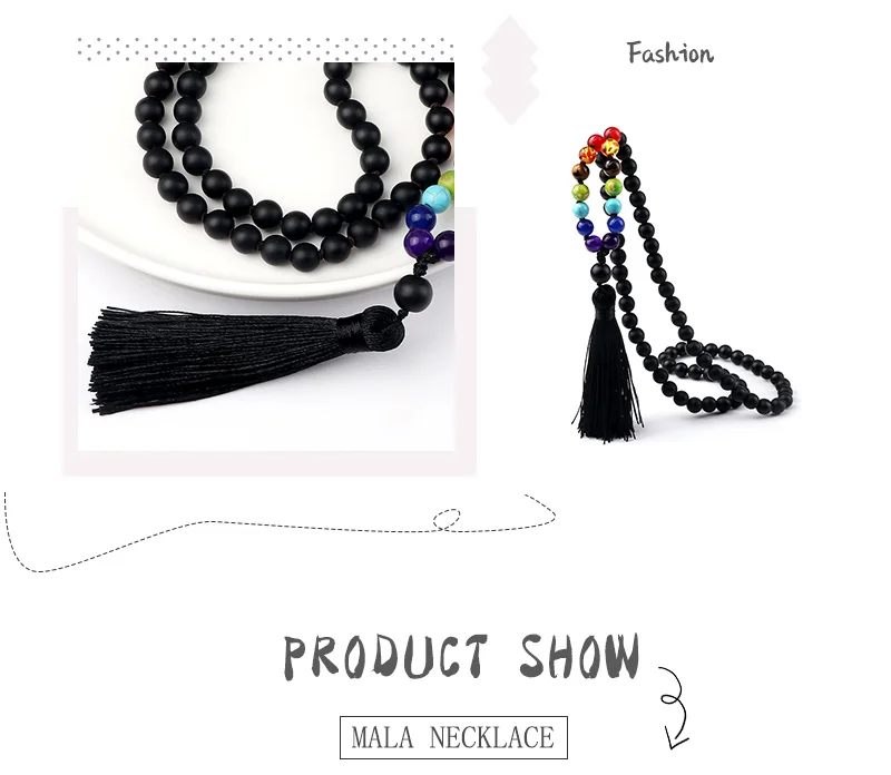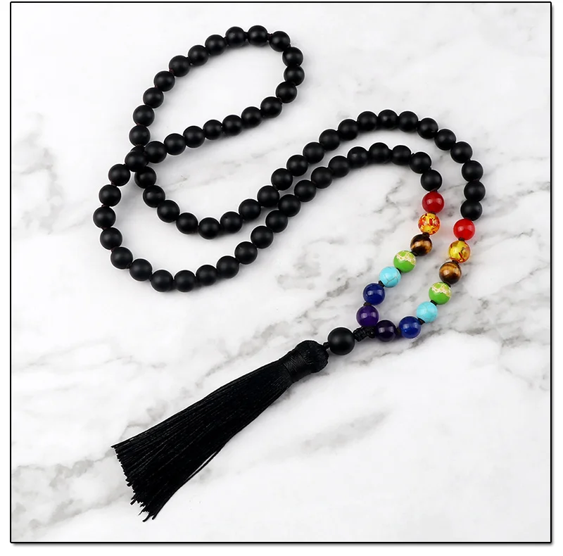 Vintage Handmade Knotted Mala Necklace 8mm Black Matte 7 Chakra Beads Tassel Pendant Necklace for Women Men Charm Reiki Jewelry