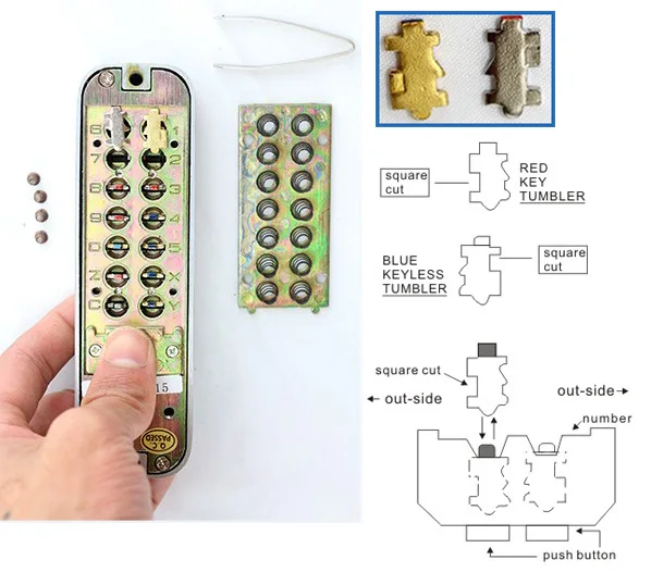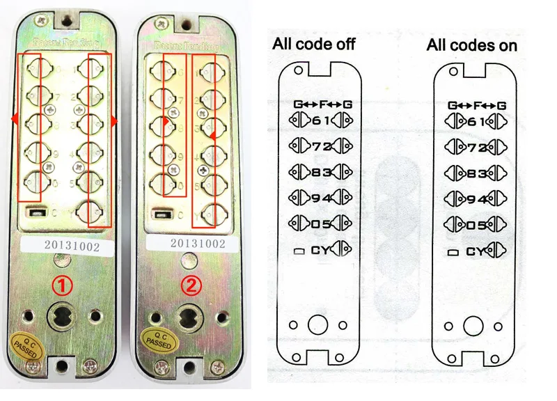 To set a button to operate within the code turn the screw relating to the button so that the dot is facing inward(towards the F),if you wish to take a button out of the code,turn the screw so that the dot is facing outward(outward G)PS:2nd lock is easier than 1st lock,cause it does not need to take off the backing panel to change the code.