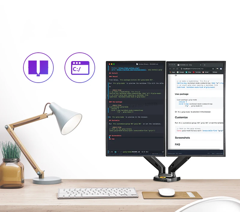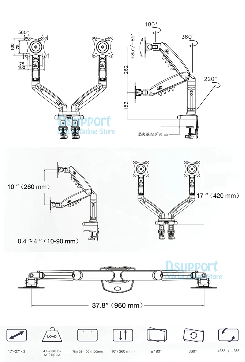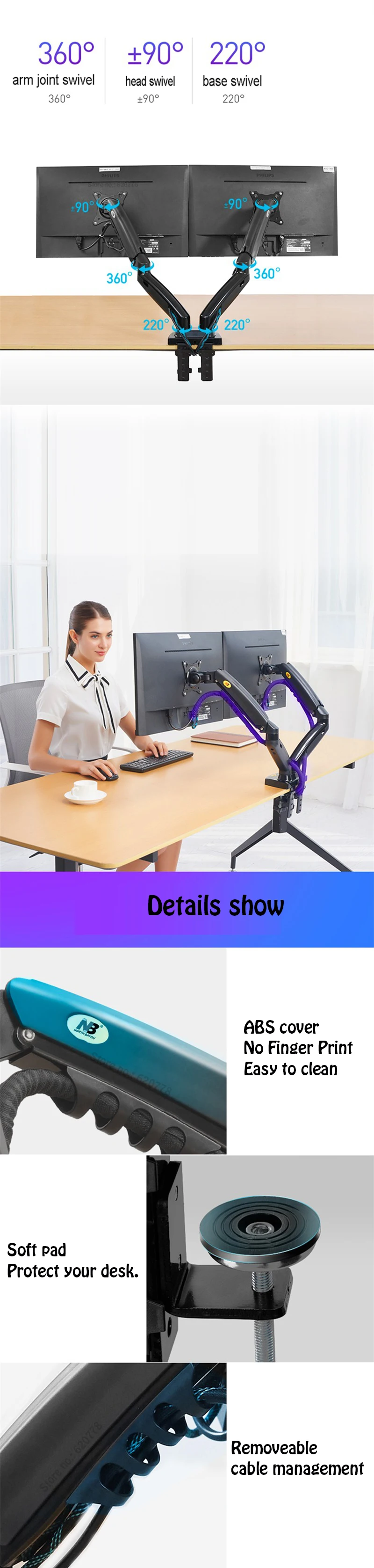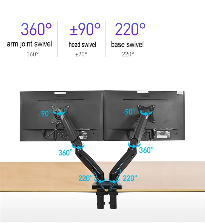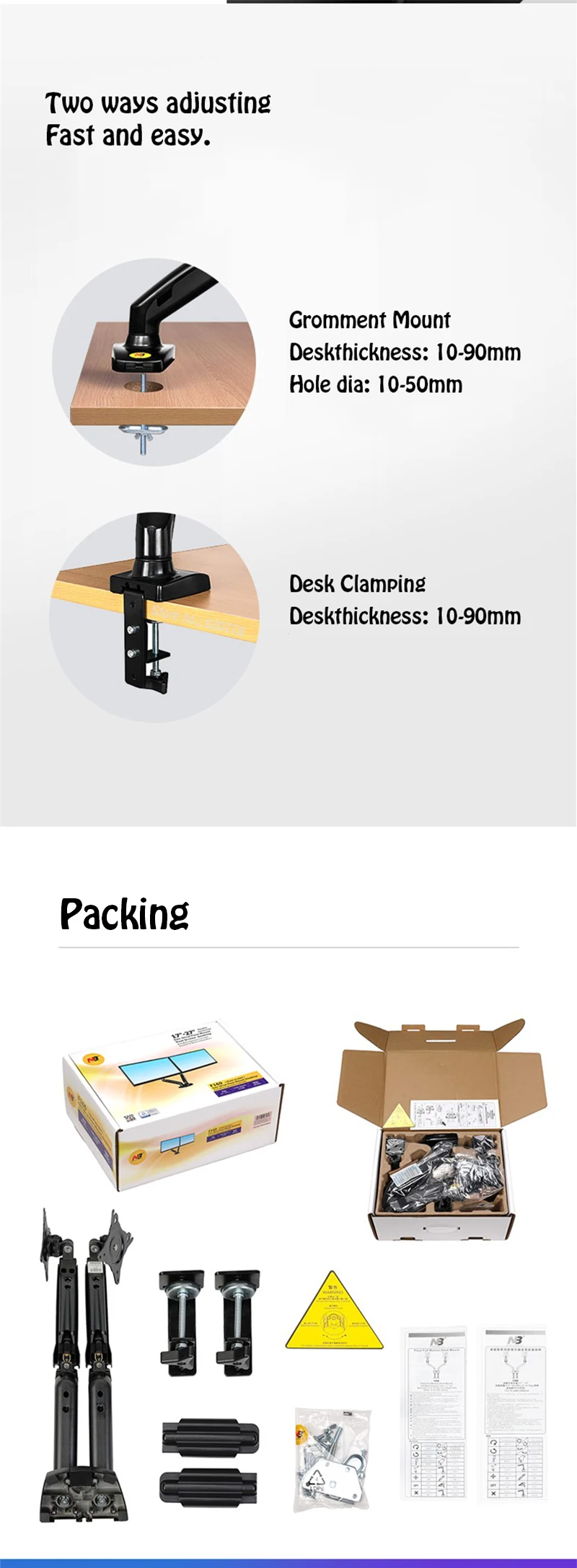 F160N desktop dual screens flexi-monitor mount is built-in durable Gas-strut cylinder to enable to move your screens any directions and height at your wish. Allow you to experiencing the best of ecological interface design for the best viewing position.