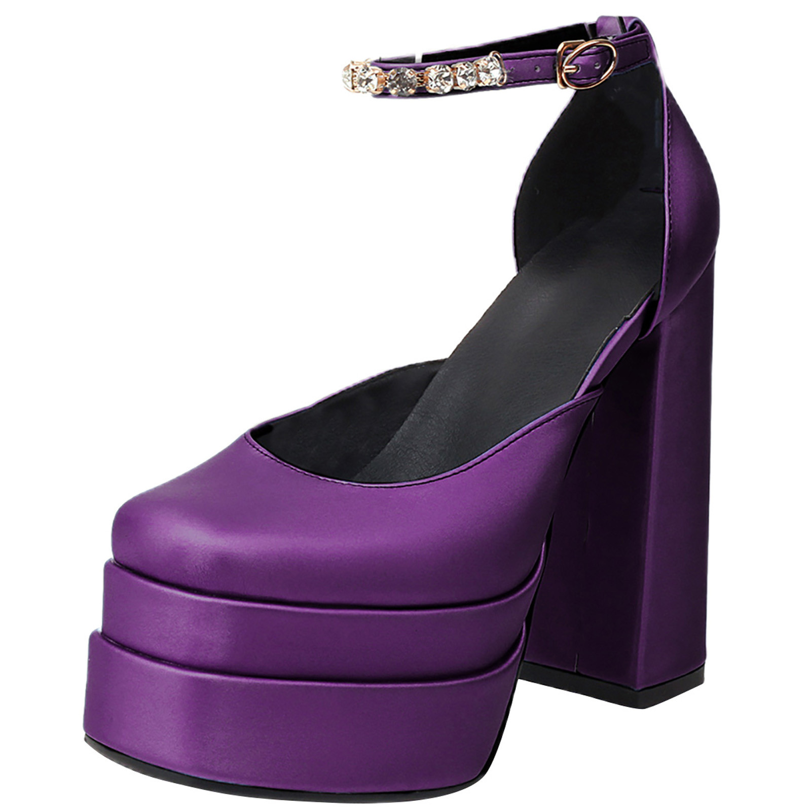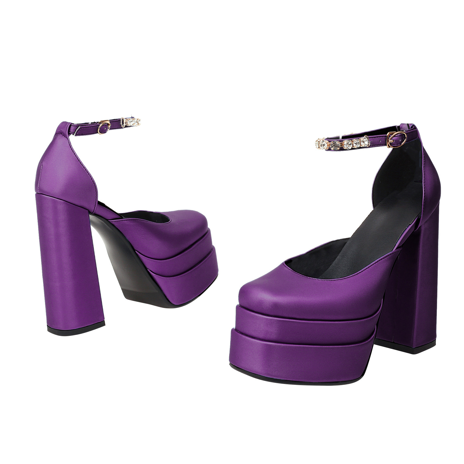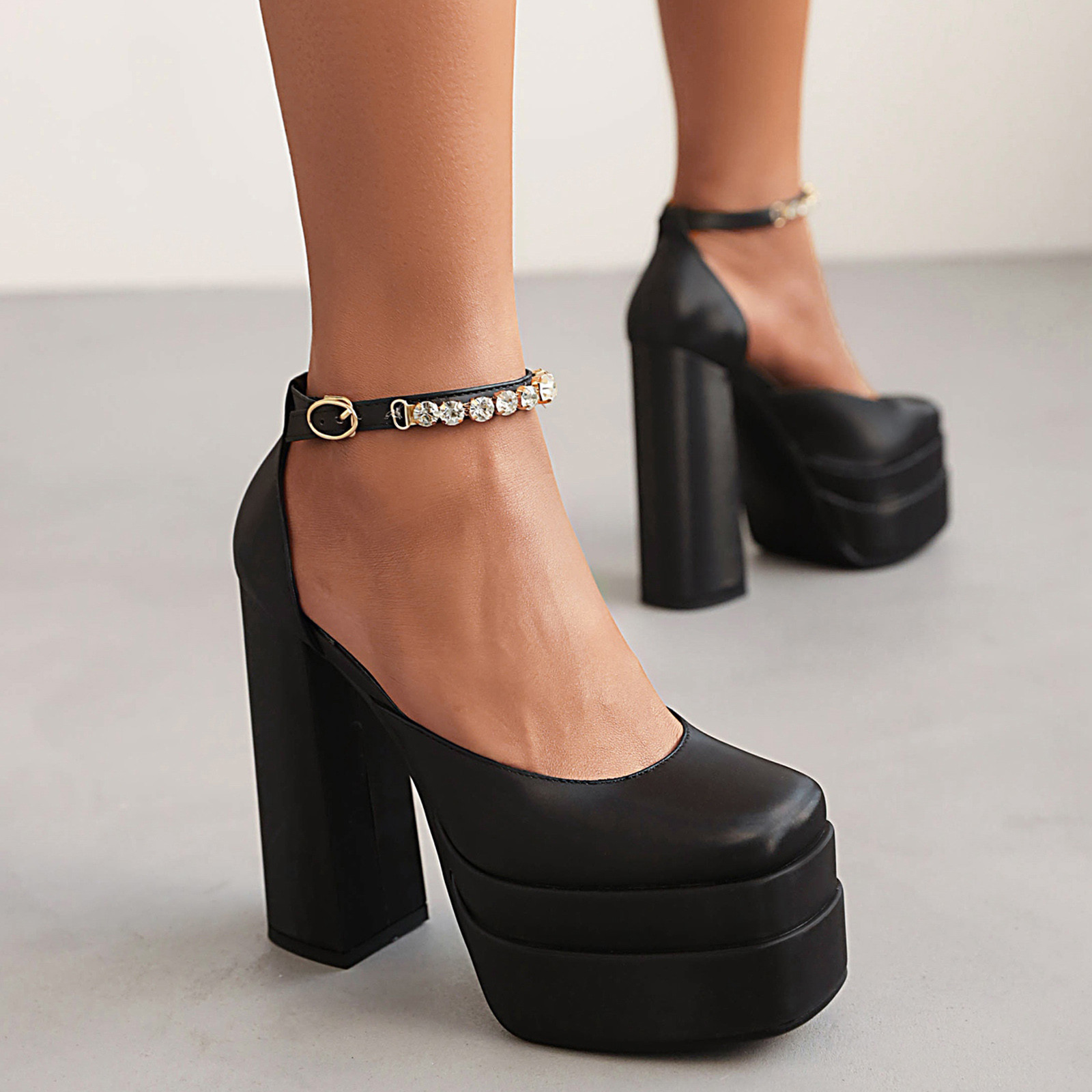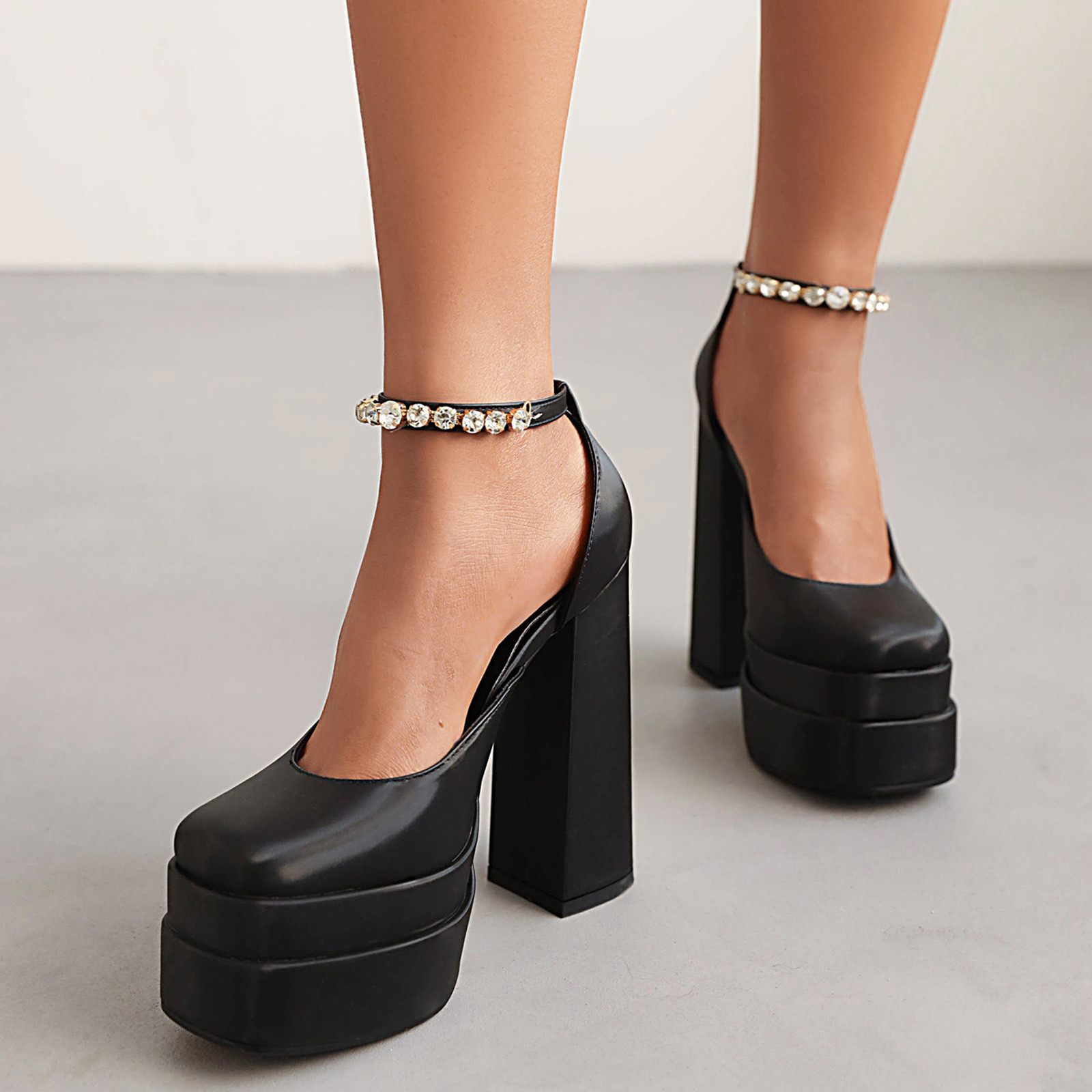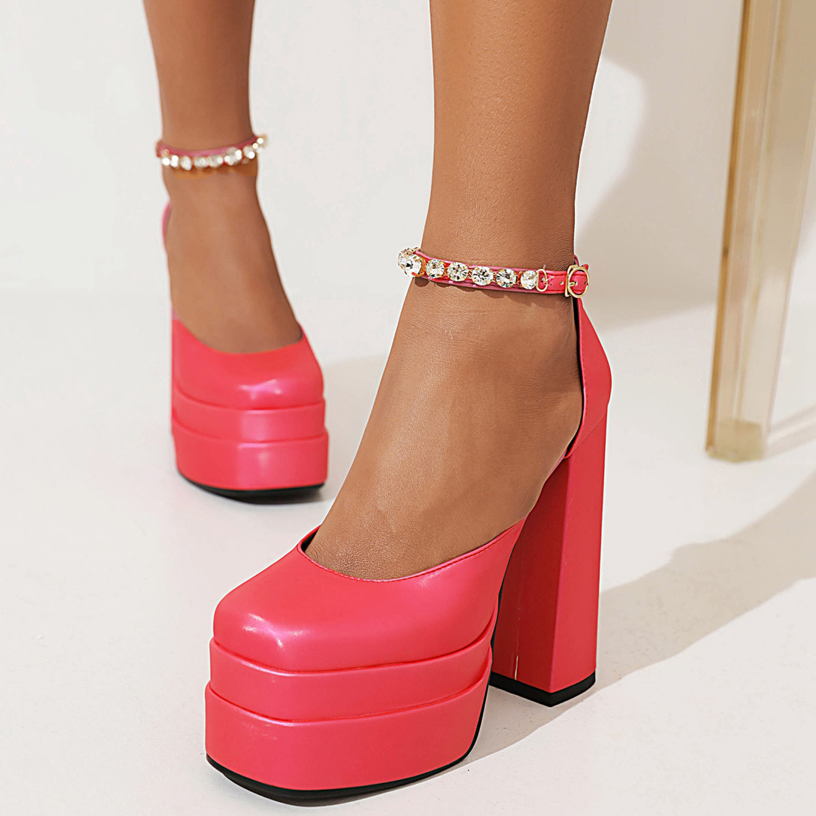 3. Дизайн с квадратным носком и очень высокий массивный каблук создают идеальное модное сочетание. Яркие цвета и узоры из страз на носке обуви придают общий блеск, Что определенно привлекает внимание.