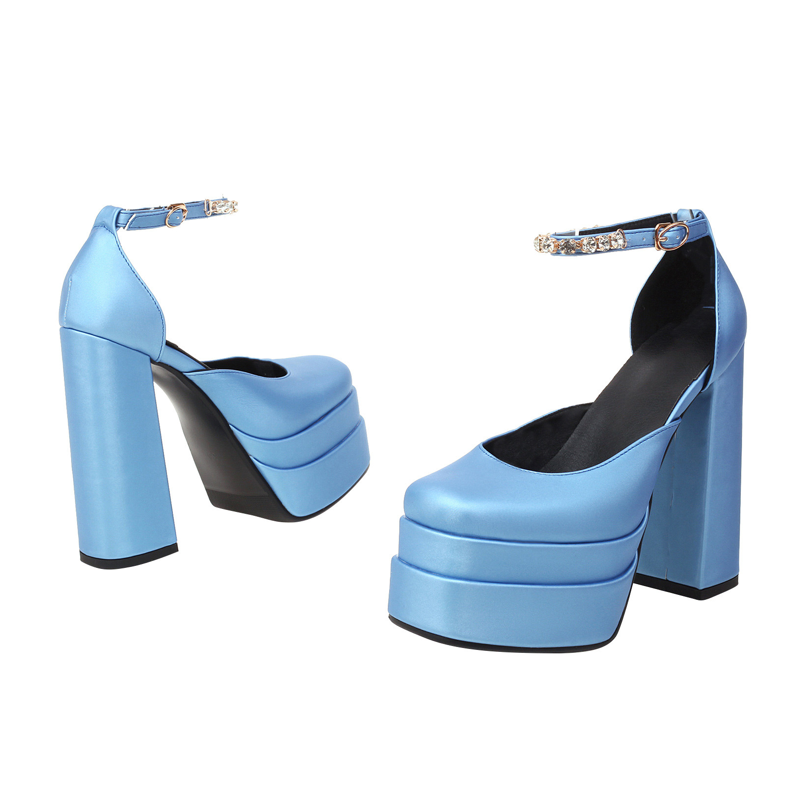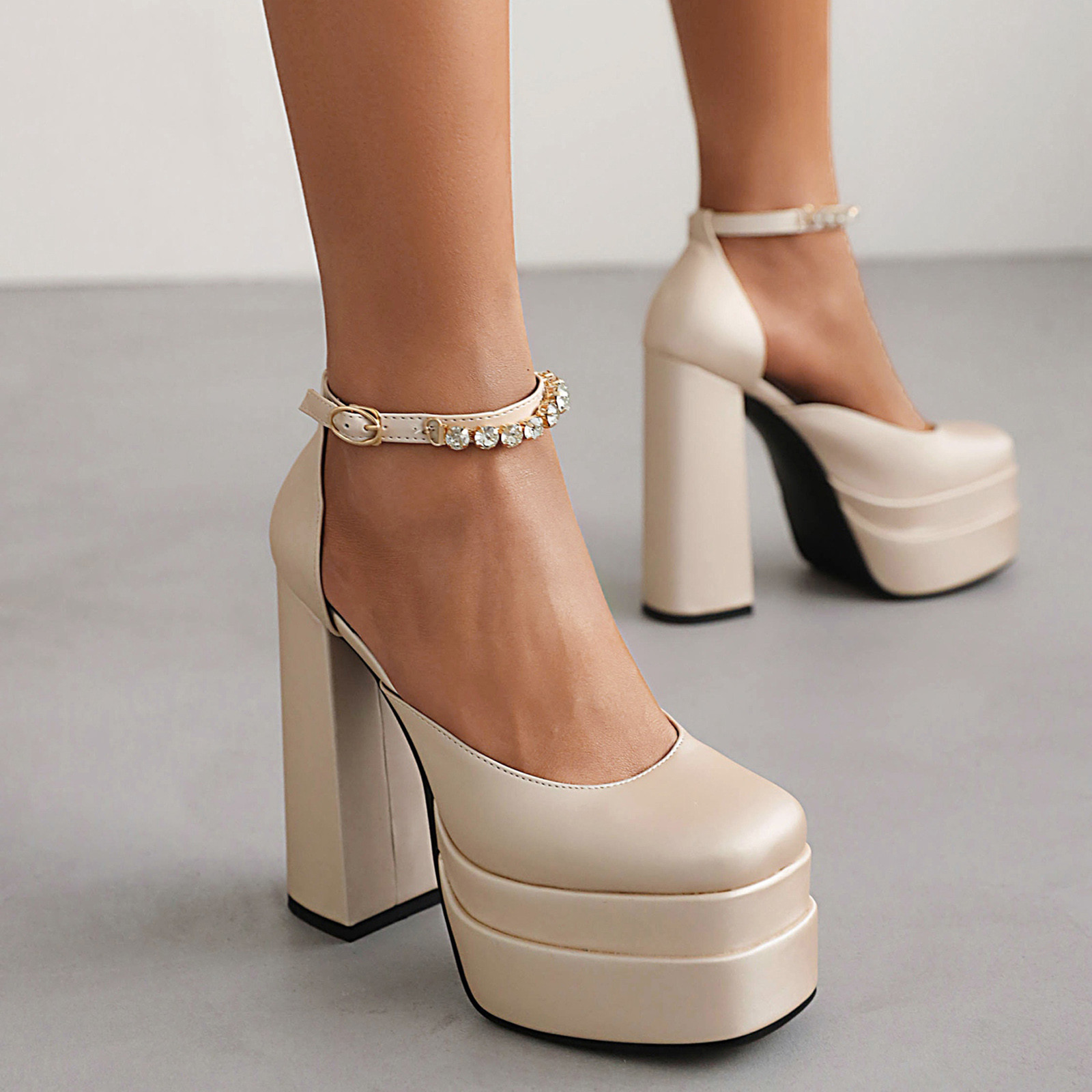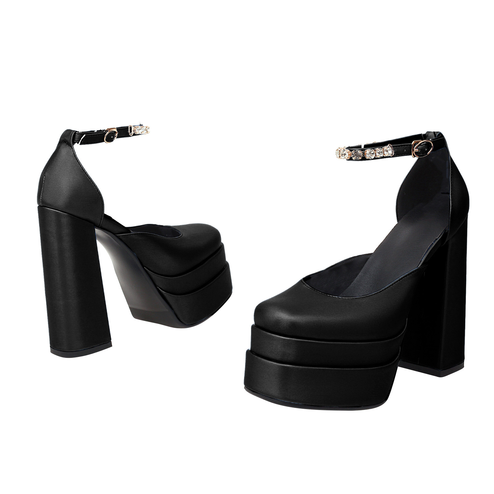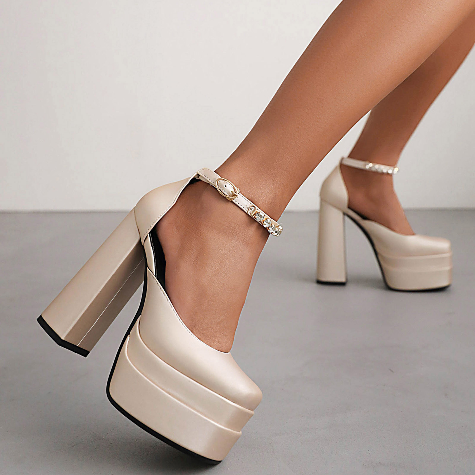 3. Дизайн с квадратным носком и очень высокий массивный каблук создают идеальное модное сочетание. Яркие цвета и узоры из страз на носке обуви придают общий блеск, Что определенно привлекает внимание.