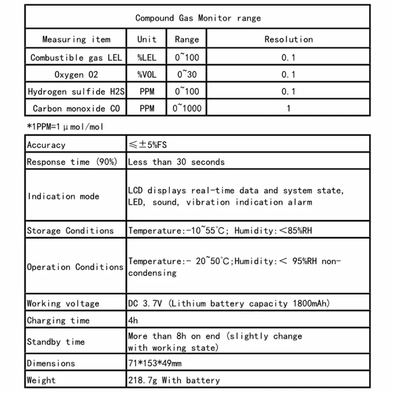 1. Измерение газа: Датчик предварительно нагревается во время включения обратного отсчета. Частота обновления-1 Гц. Не заряжайте в процессе измерения легковоспламеняющегося газа или взрыва.