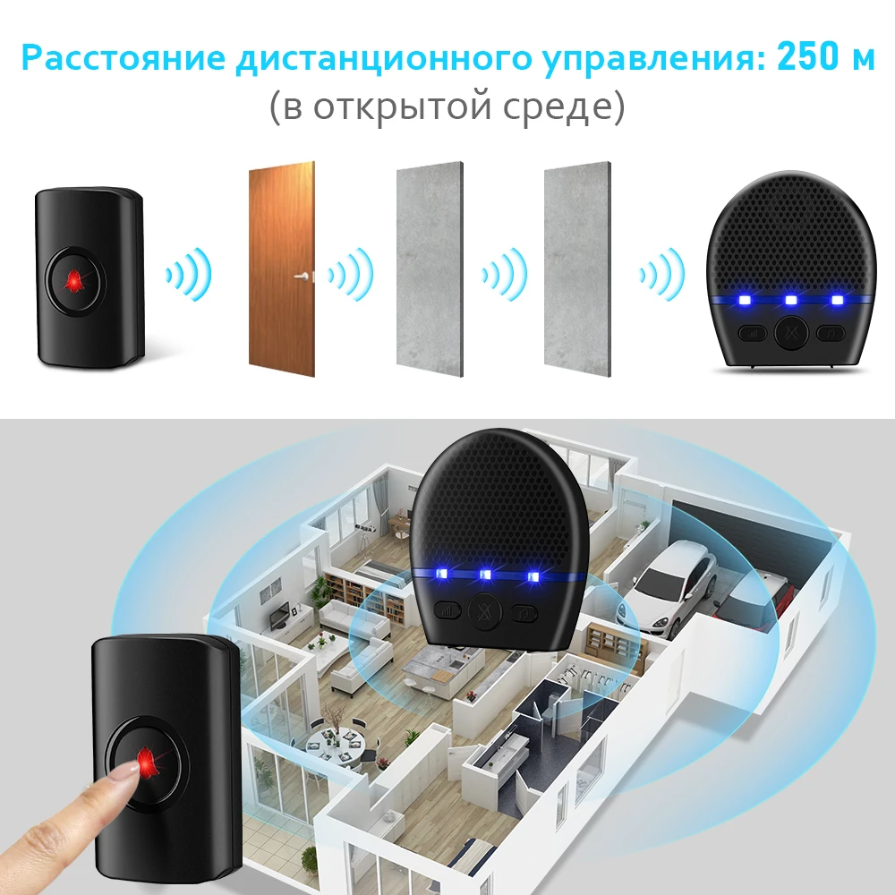 Дверном звонке имеет 38 песен, миллионы обучения коды и не будет повторять код, 4-ступенчатая регулировка громкости и тишина функции, Синий светодиодный флэш-памяти, отключения памяти, объем сброса и т. д.