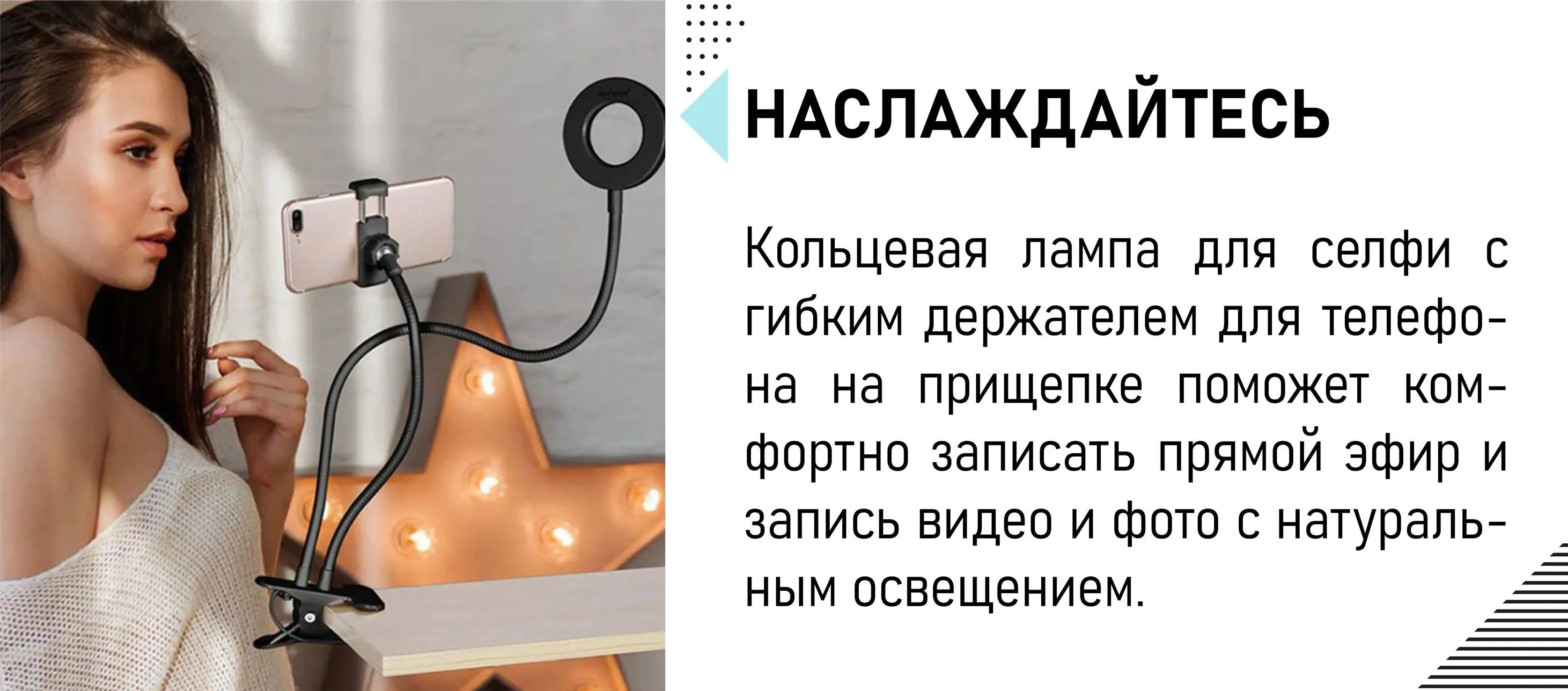 Кольцевая лампа для селфи с гибким держателем для телефона на прищепке (Черный). С помощью данного устройства можно делать комфортный прямой эфир и запись видео и фото с натуральным освещением. Гибкие прочные стойки позволяют легко выставить свет под нужным углом, и удобно установить смартфон. Сам же кольцевой свет LED лампы отлично передает контуры лица, цвет волос и оттенки макияжа, предметы. Так же с помощью удобного маленького пульта возможна регулировка как яркости, так и температуры света (холодный свет, теплый свет и нейтральный). -У светового кольца есть 3 режима света: желтый, теплый белый, холодный белый. У каждого режима света есть 4 вида яркости 25%, 50%, 75%, 100%. -Пульт регулировки яркости и цветовой температуры (холодный свет, теплый свет и нейтральный); -Питание от USB даст возможность подключится к Power Bank, ноутбуку , компьютеру или кубика для зарядки телефонов и планшетов.