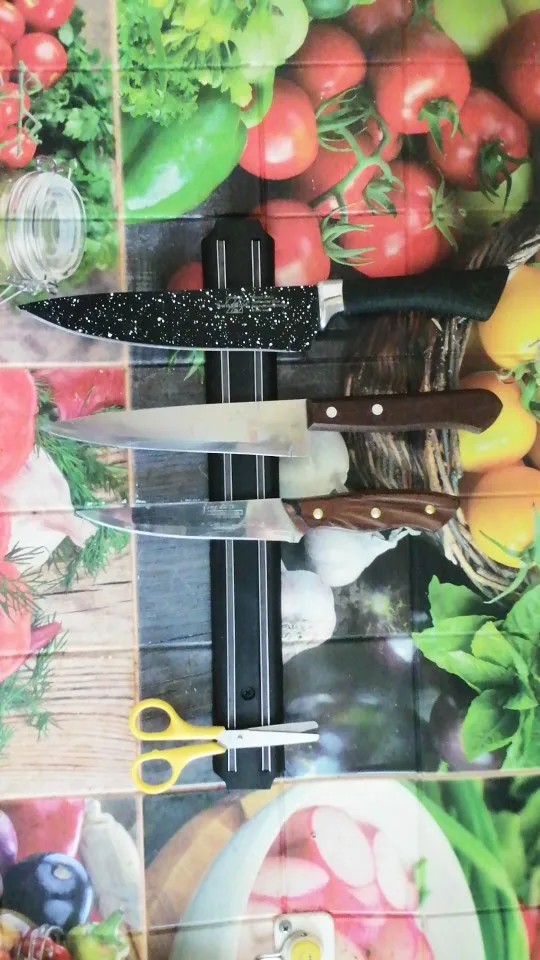 Кухонные ножи лучше держат заточку, когда не соприкасаются лезвиями друг с другом. В ящике для столовых приборов это неизбежно. К счастью, есть выход: держать ножи на специальном магнитном держателе. Легкую планку с магнитными полосами можно повесить в любом месте, даже на дверцу шкафа.